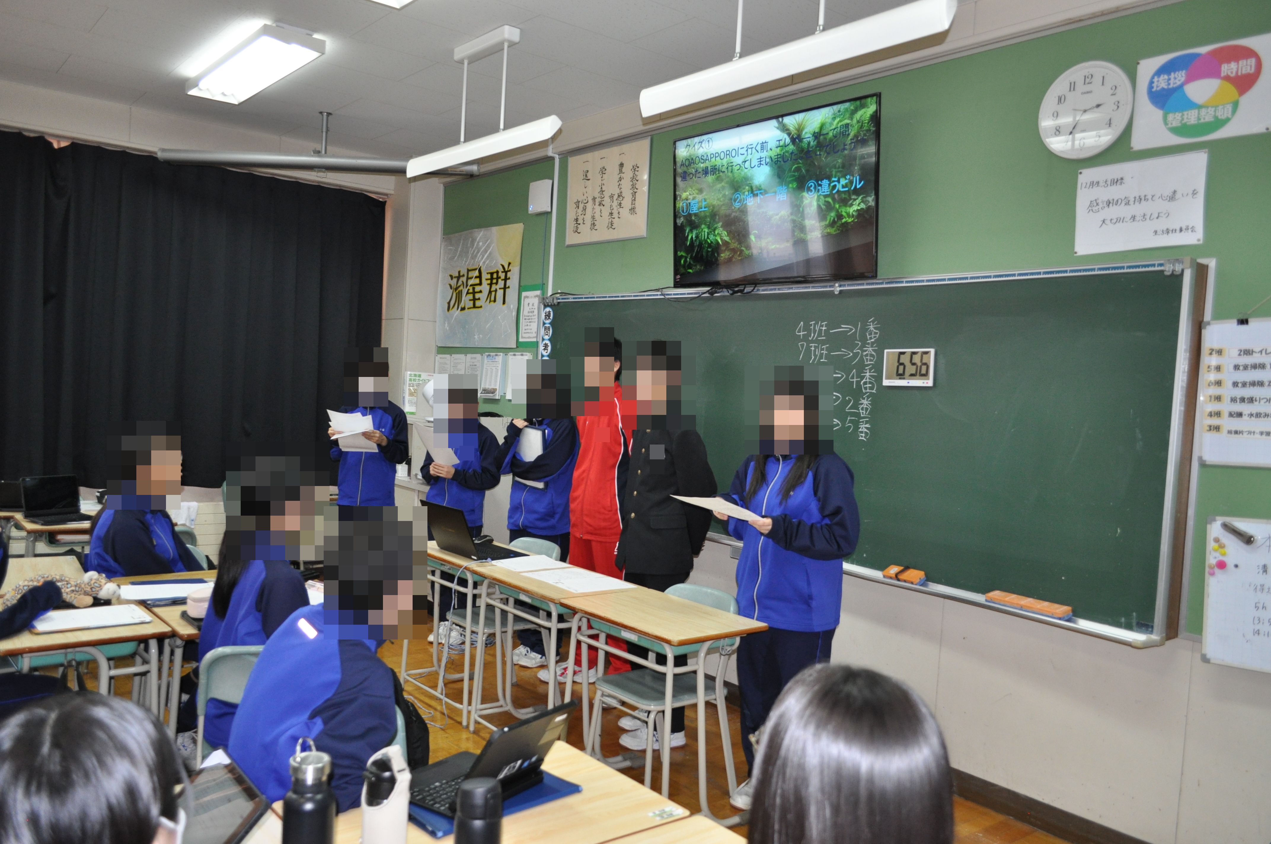 後期の生徒総会が開催され、活発な質疑応答が行われていました。質問される側もする側も大変立派な態度でした。また、別の時間には1年生対象の食の指導が行われました。講師で来校していただいた栄養士の先生に感謝です。ありがとうございました。