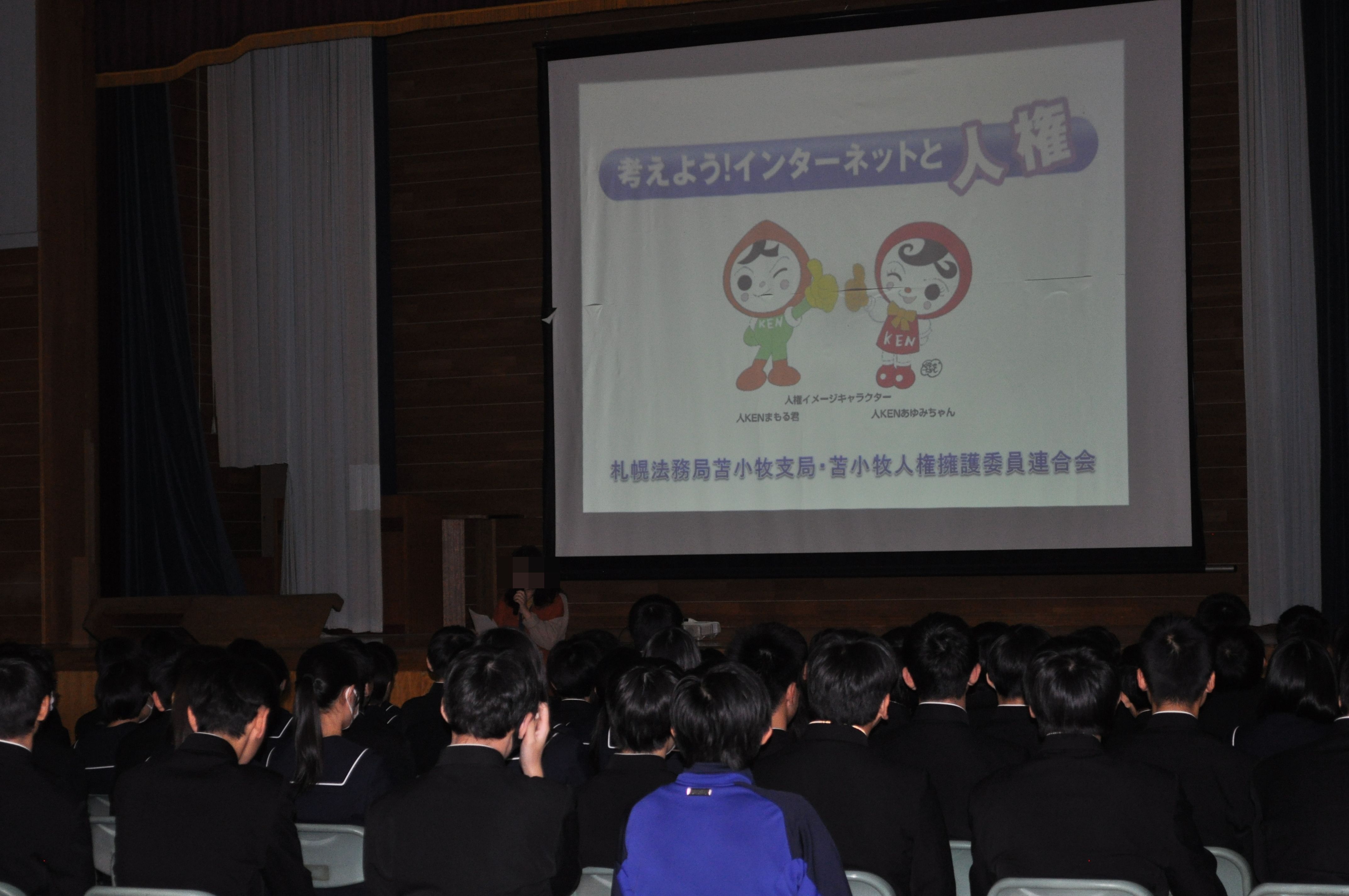 1年生対象の防犯教室が行われました。苫小牧警察署生活安全課の方が講師として来校し、不審者対策や自転車の盗難、SNSによる個人情報流出について講義してくれました。ありがとうございました。