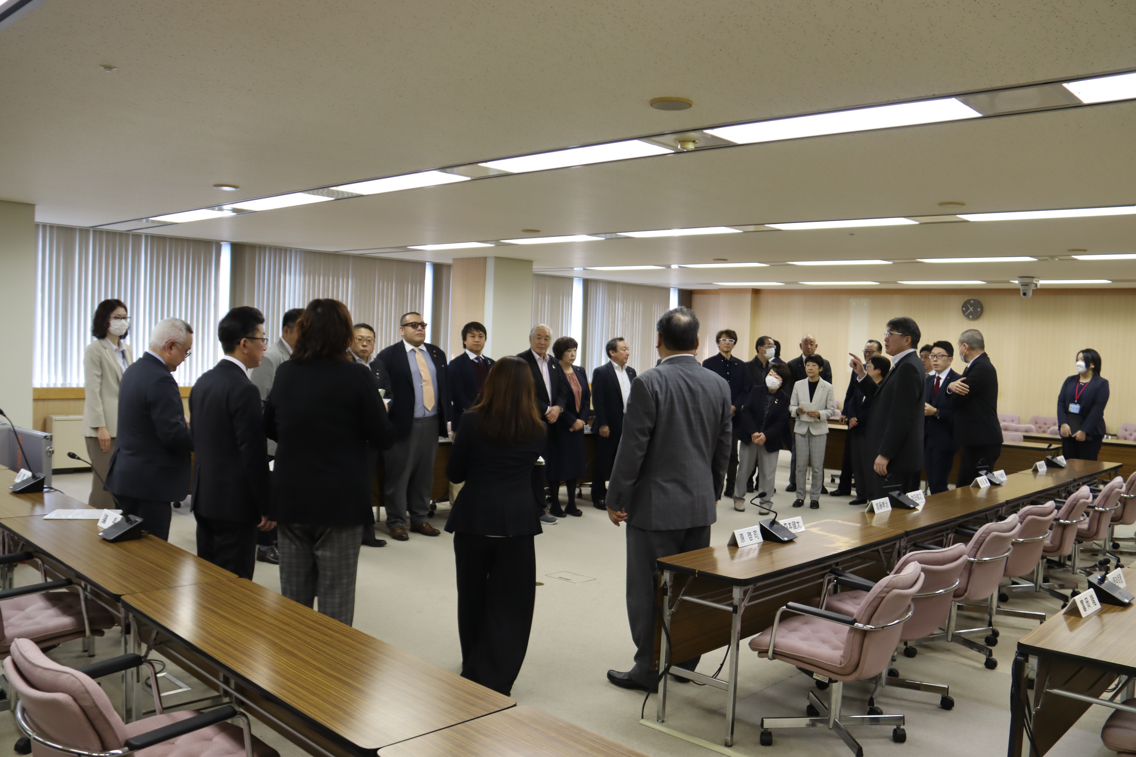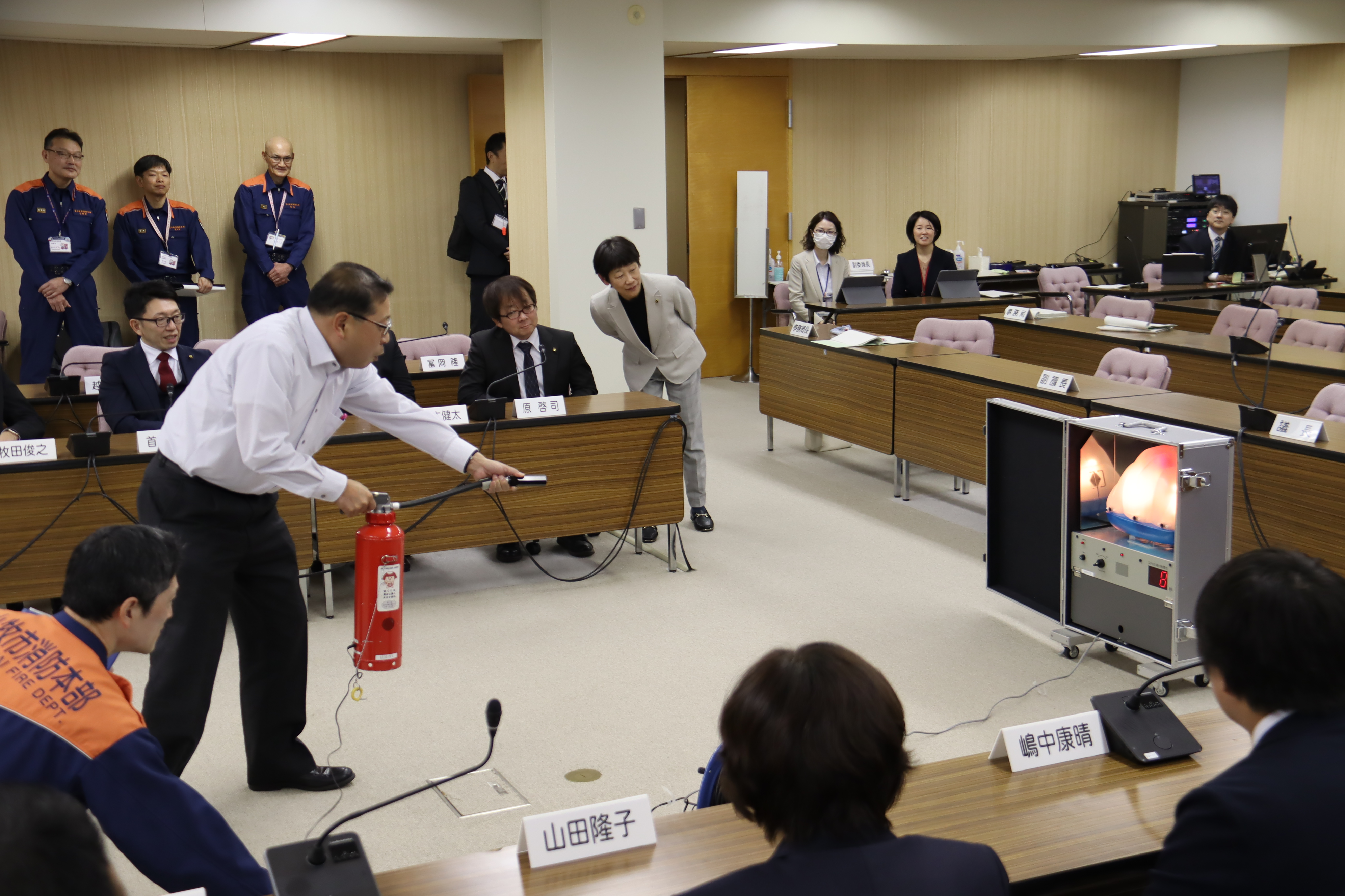 令和7年11月26日実施のBCP防災訓練では、定例会会議中に大規模地震及び議場と同フロア南側で火災が発生したことを想定した訓練を実施しました。地震発生時には各自、身の安全を確保し、職員が傍聴者へ安全確保の呼びかけを行いました。また、火災発生時には、職員の誘導により議員、傍聴者が議場から実際に避難し、一部の議員及び職員は火災の初期消火活動に従事するなど、災害発生時の行動を確認しました。