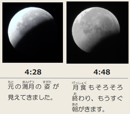 その後はまた左側から徐々に元の姿に戻っていきます。市内では完全にもとの明るさに戻る前に空が明るくなりはじめ、月とは反対側の東側の空から5時5分ごろ太陽が昇ってきます。