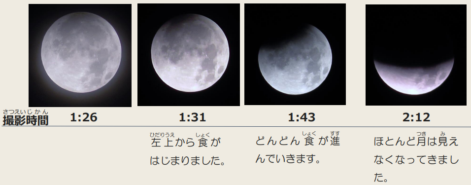 そうして2時30分ごろに皆既食のはじまりです。赤銅色とよく言われる暗い赤色の月を見てみてください。食が進むごとにその色や明るさのグラデーションがわずかに変わるので、双眼鏡をお持ちの方は双眼鏡を使うとまた違った楽しみ方ができるでしょう。皆既食は3時53分ごろまで続きます。