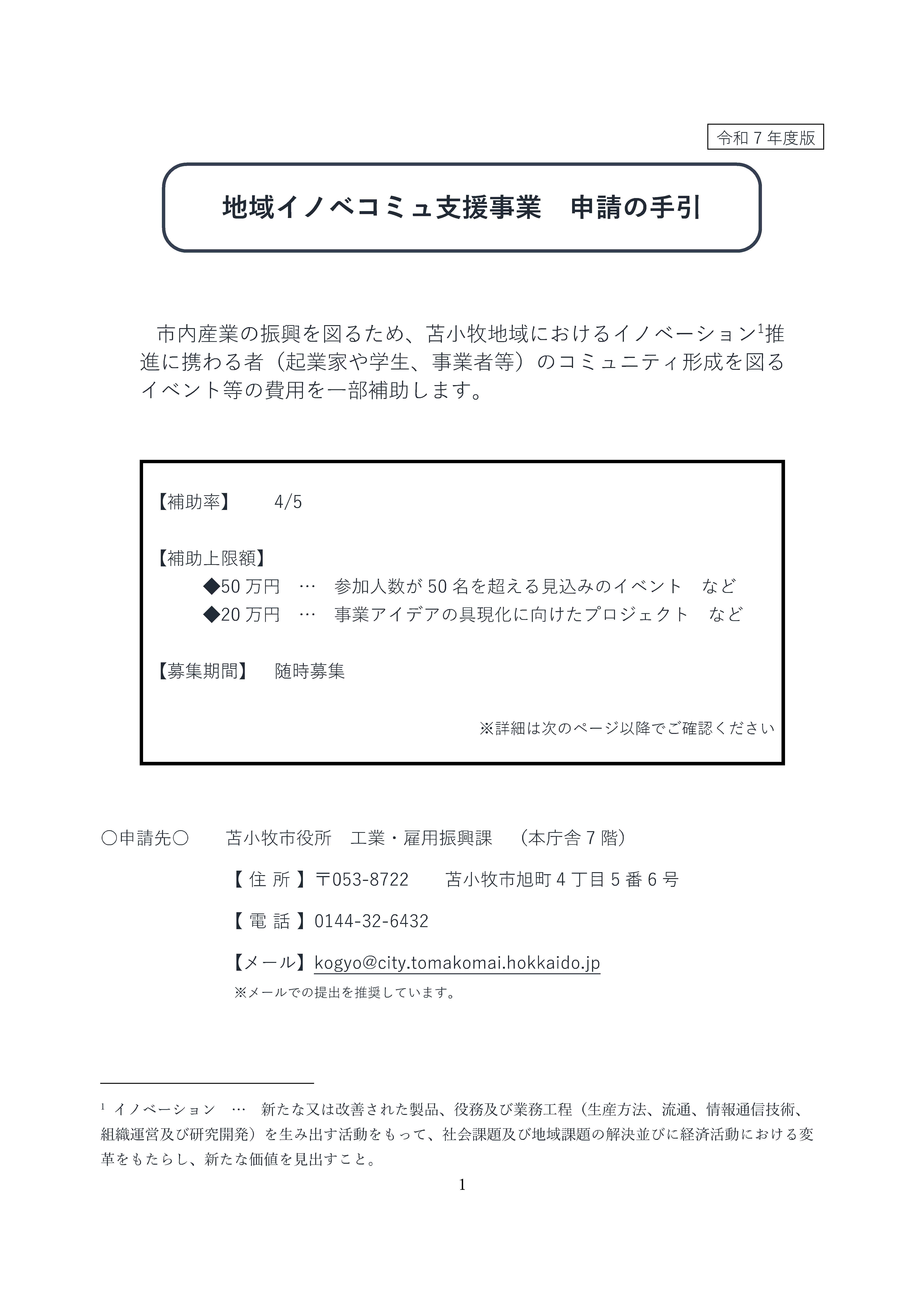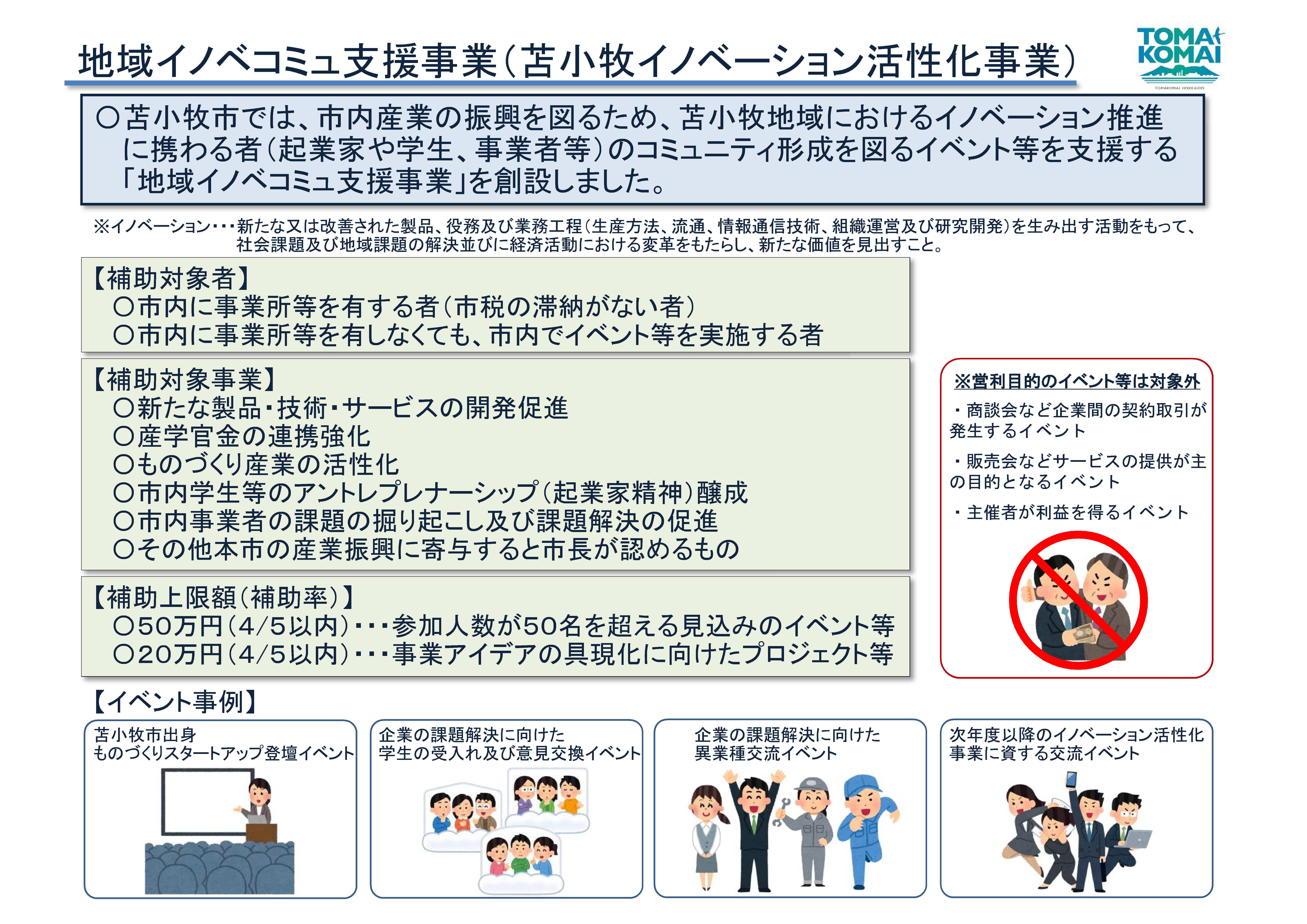 市内産業の振興を図るため、苫小牧地域におけるイノベーション推進に携わるもの(起業家や学生、事業者等)のコミュニティ形成を図るイベント等の費用を一部補助します。申請は随時受け付けております。申請内容につきましてもお気軽にご相談ください。