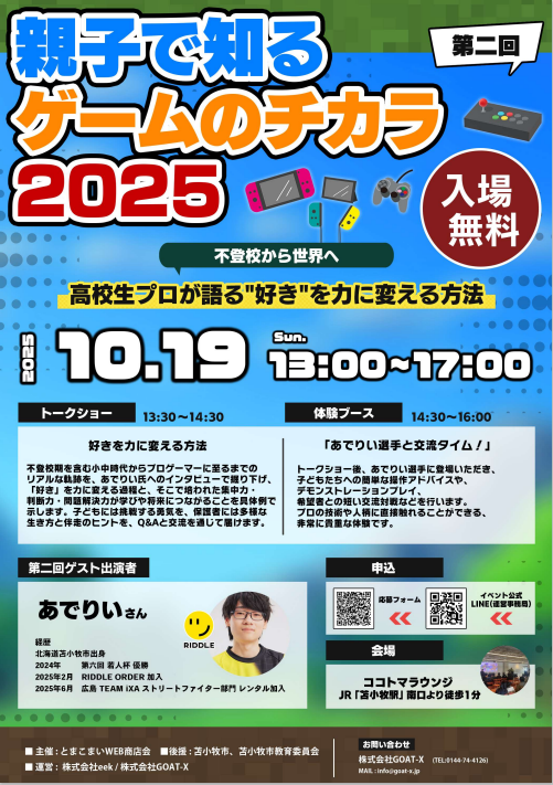 苫小牧市出身の高校生プロeスポーツプレーヤー(ストリートファイター6)「RIDDLE ORDER」所属の あでりい選手 が登場! トークショーでは、不登校の時期からプロゲーマーに転向するまでのリアルな軌跡を語り、「好き」を力に変えるヒントや、挑戦する勇気、多様な生き方についてメッセージを届けます。 さらに!トークショー後には あでりい選手との交流対戦 も予定しています🔥 |