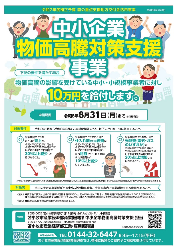 苫小牧市産業経済部商業振興課 中小企業物価高騰対策支援 担当☎0144-32-6447 8:45~17:15(平日)