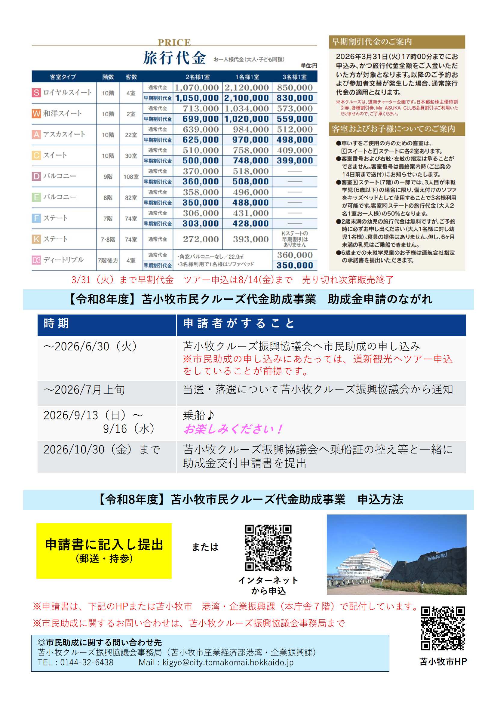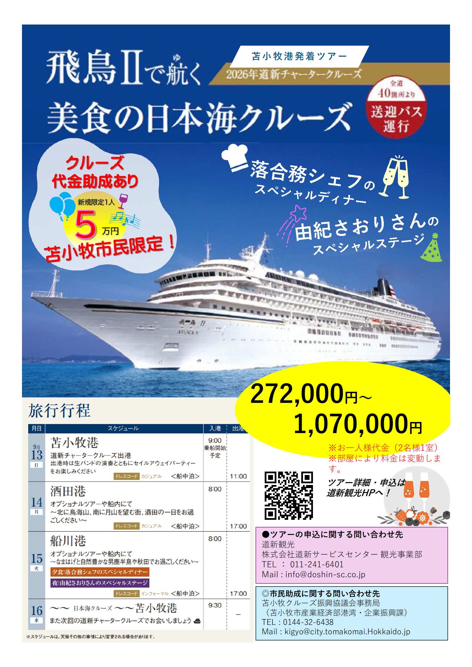 苫小牧クルーズ振興協議会より、苫小牧市民を対象にクルーズ代金の助成も行います。