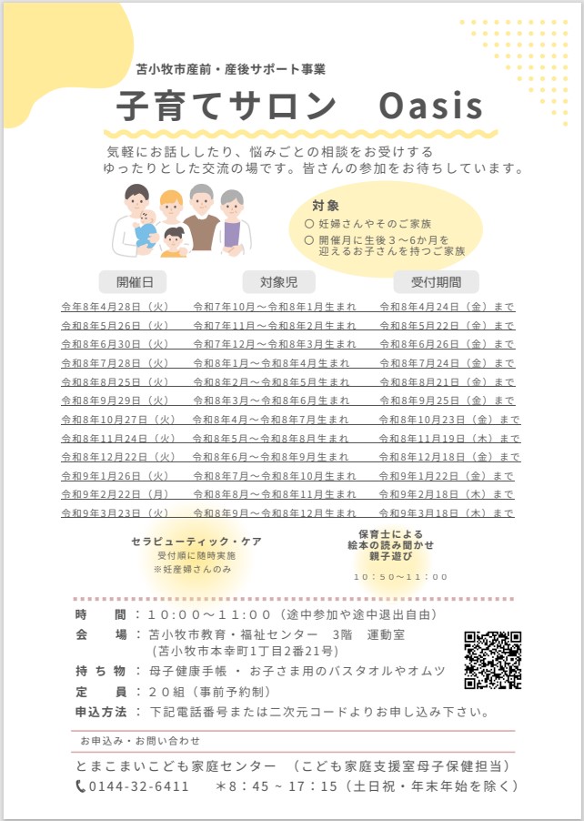 産前・産後サポート事業として『 子育てサロン Oasis 』を開催しています。妊婦さんやそのご家族、開催月に生後3~6か月を迎えるお子さんをもつご家族同士、気軽にお話したり、悩みや相談をお受けするゆったりとした" 交流の場 "です。皆さんの参加をお待ちしております。