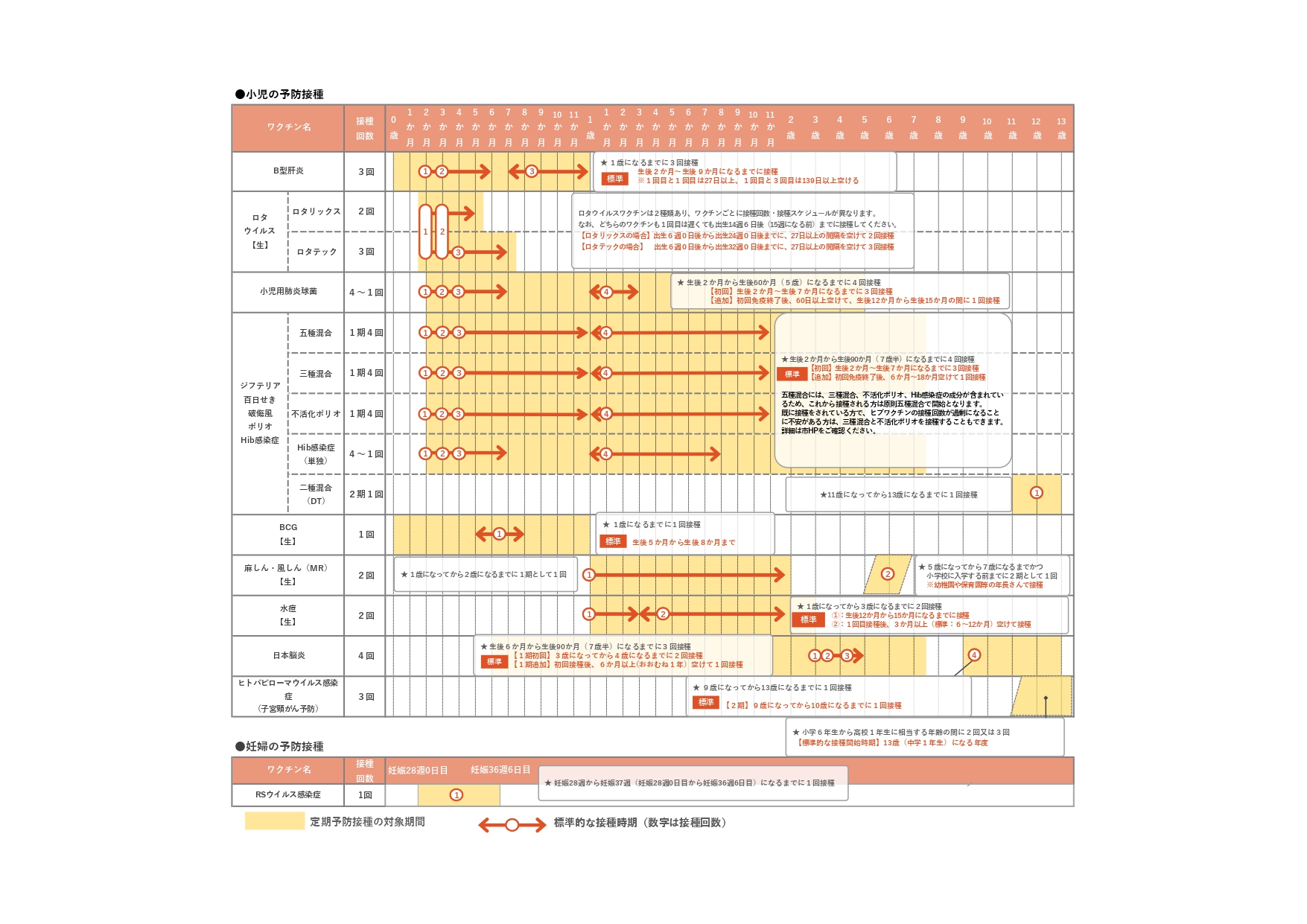 いつ、どのようなワクチンを接種できるのかを記した予防接種スケジュールを掲載しています。予防接種の計画を立てる際にご活用ください。【※画像クリックで拡大版が開きます。】