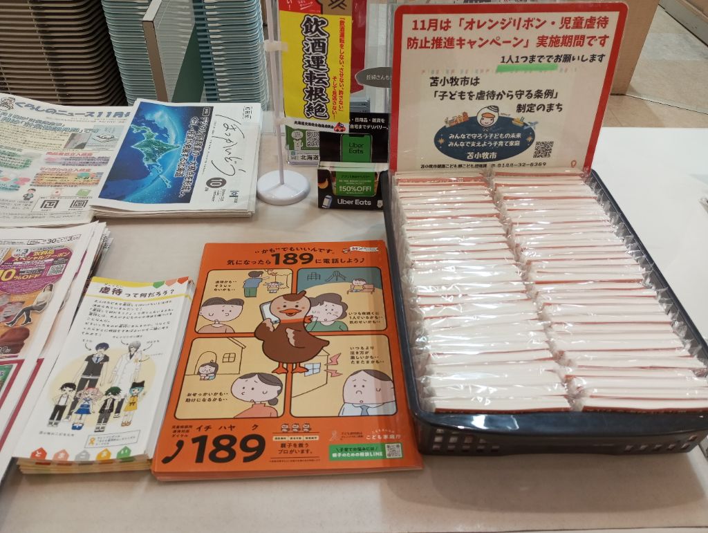 ■イオン苫小牧店における児童虐待防止啓発用のポケットティッシュの手配り配布(11月13日)及び設置配布(11月1日~11月25日)