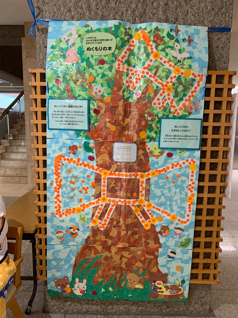 令和6年度に引き続き、ぬくもりの木にリボンの枠を用意しました。その枠にオレンジ色の丸いシールを、市民の皆様に貼っていただいたことで、写真のように見事なオレンジリボンを完成させることができました。