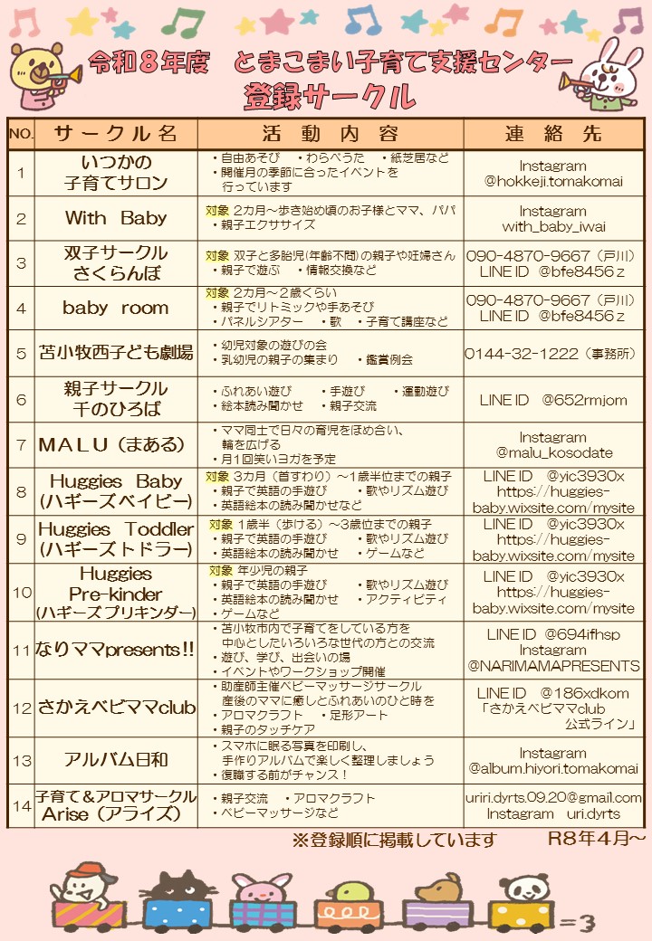 各サークル活動への参加を希望される方、新しくサークル登録を希望される方は子育て支援センターまでお問い合わせ下さい。