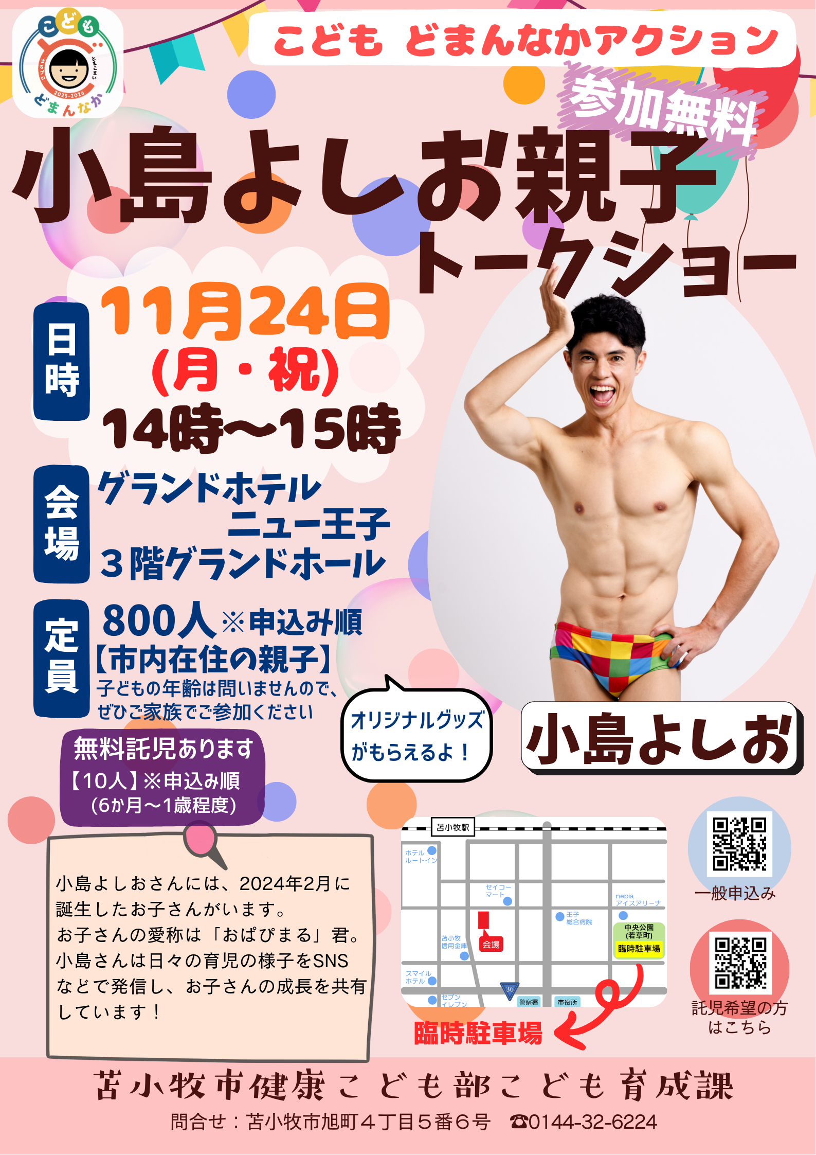 本市では、「こども・子育てにやさしいまち 苫小牧」の実現を目指し、「選ばれるまちプロジェクト」として、「こども どまんなかアクション」を展開しています。この「こども どまんなかアクション」のイベントとして、こども家庭庁が定める11月の「秋のこどもまんなか月間」に合わせて、小島よしお親子トークショーを開催します。