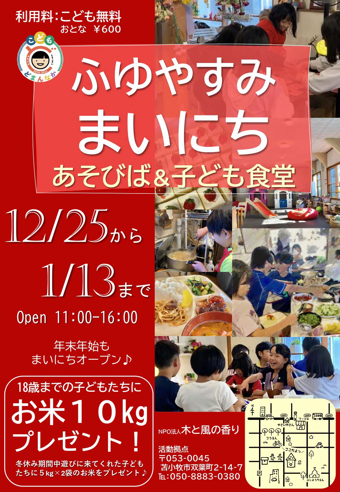 イベント内容12/25~1/13までの冬休み期間に毎日子ども食堂&遊び場を開催します。