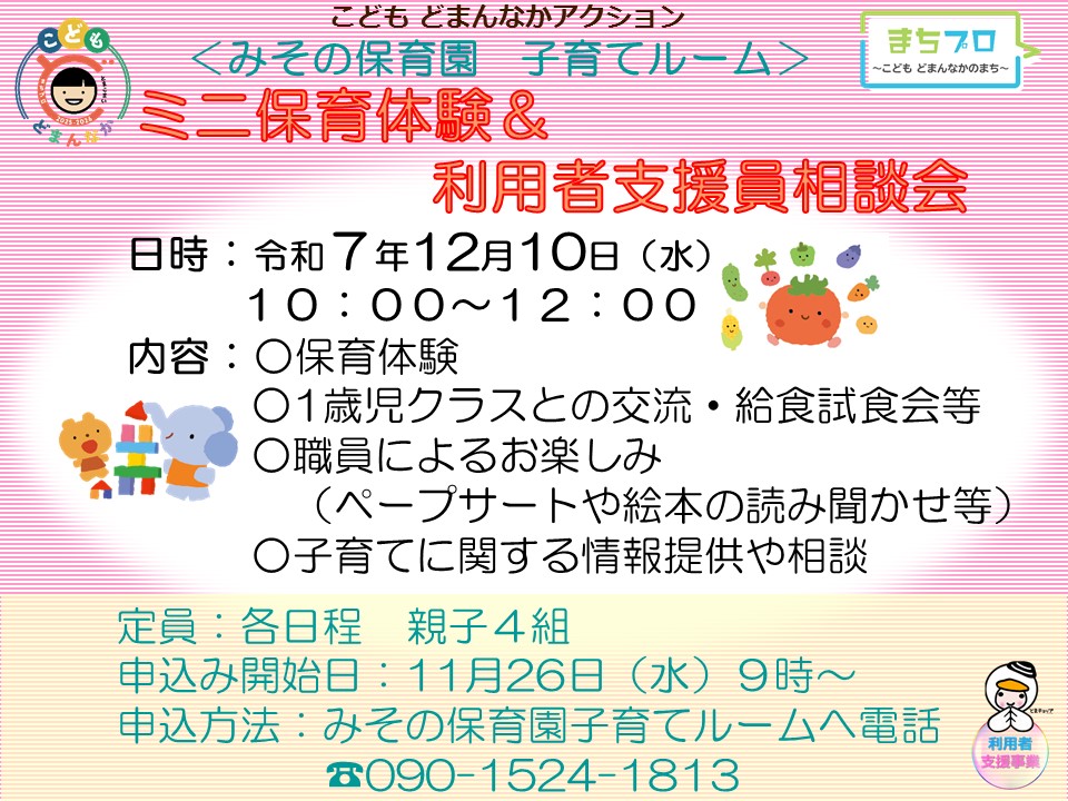 | ミニ保育体験&利用者支援員相談会 ~みその保育園 子育てルーム~ |