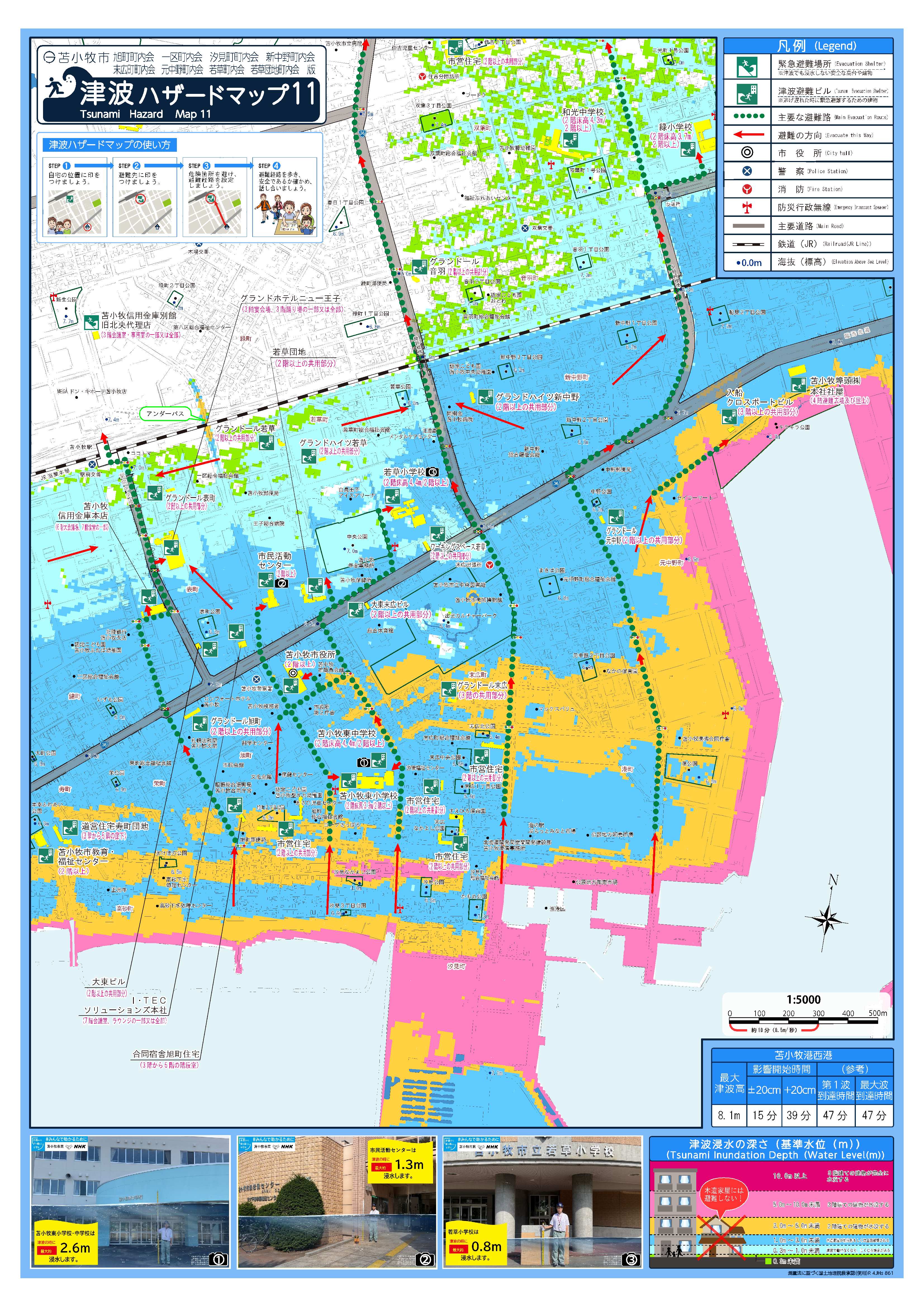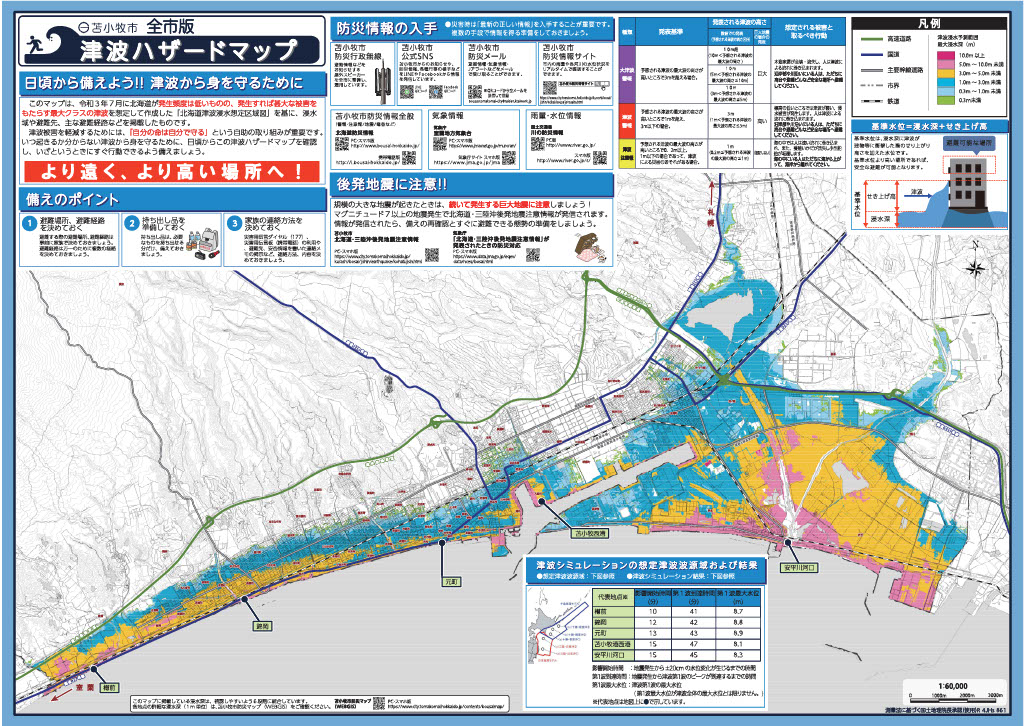 この津波ハザードマップは、令和3年7月に北海道が作成した「北海道津波浸水想定区域図」を基に、浸水域や避難先、主な避難経路などを掲載したものです。