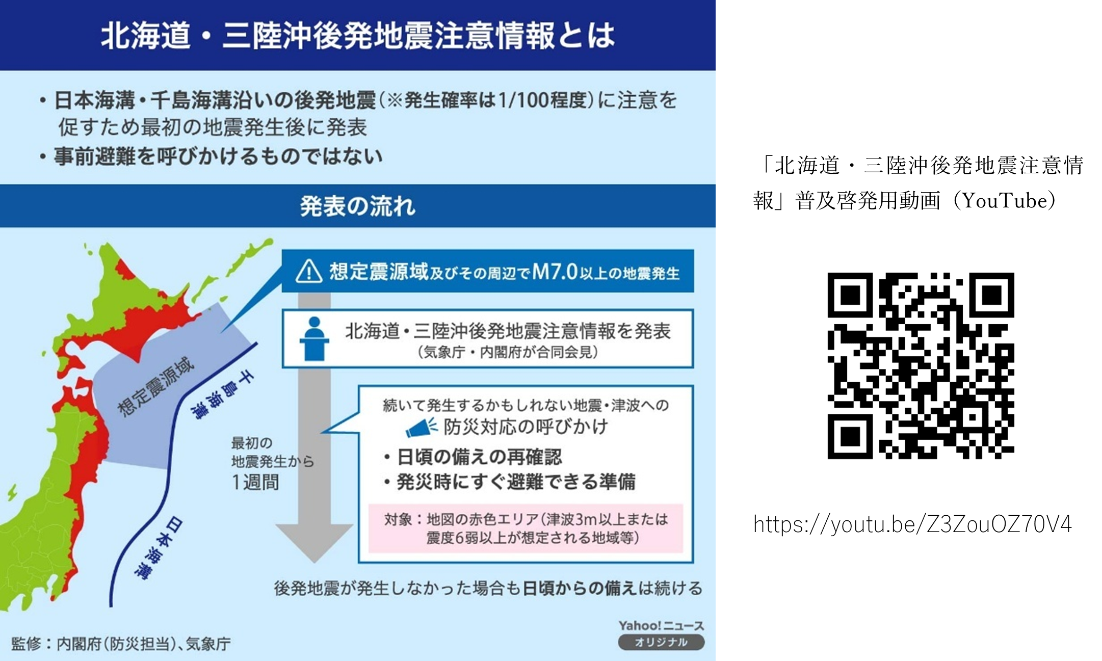 「北海道・三陸沖後発地震注意情報」は、日本海溝・千島海溝沿いの想定震源域やその周辺でマグニチュード7.0以上の地震が発生した後、続いて巨大地震(後発地震)の発生する可能性が平常時より相対的に高まっている際に発表される情報です。また、巨大地震の発生可能性が平常時より想定的に高まっていると言っても、特定の期間中に巨大地震が必ず発生するということをお知らせするものではありません。このような背景があるものの情報を発表するのは、比較的大きな地震が発生した後に、その周辺で巨大地震が発生している事例が知られ、たとえ不確実性が高くとも警戒レベルを上げ被害軽減を図り、地震への日頃の備えと準備を呼びかけ、より多くの人命を守る取組です。