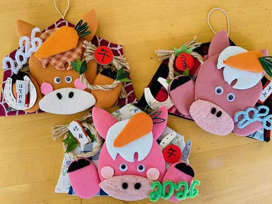 古布と段ボールを使って、来年の干支である午年の絵馬を作ります。