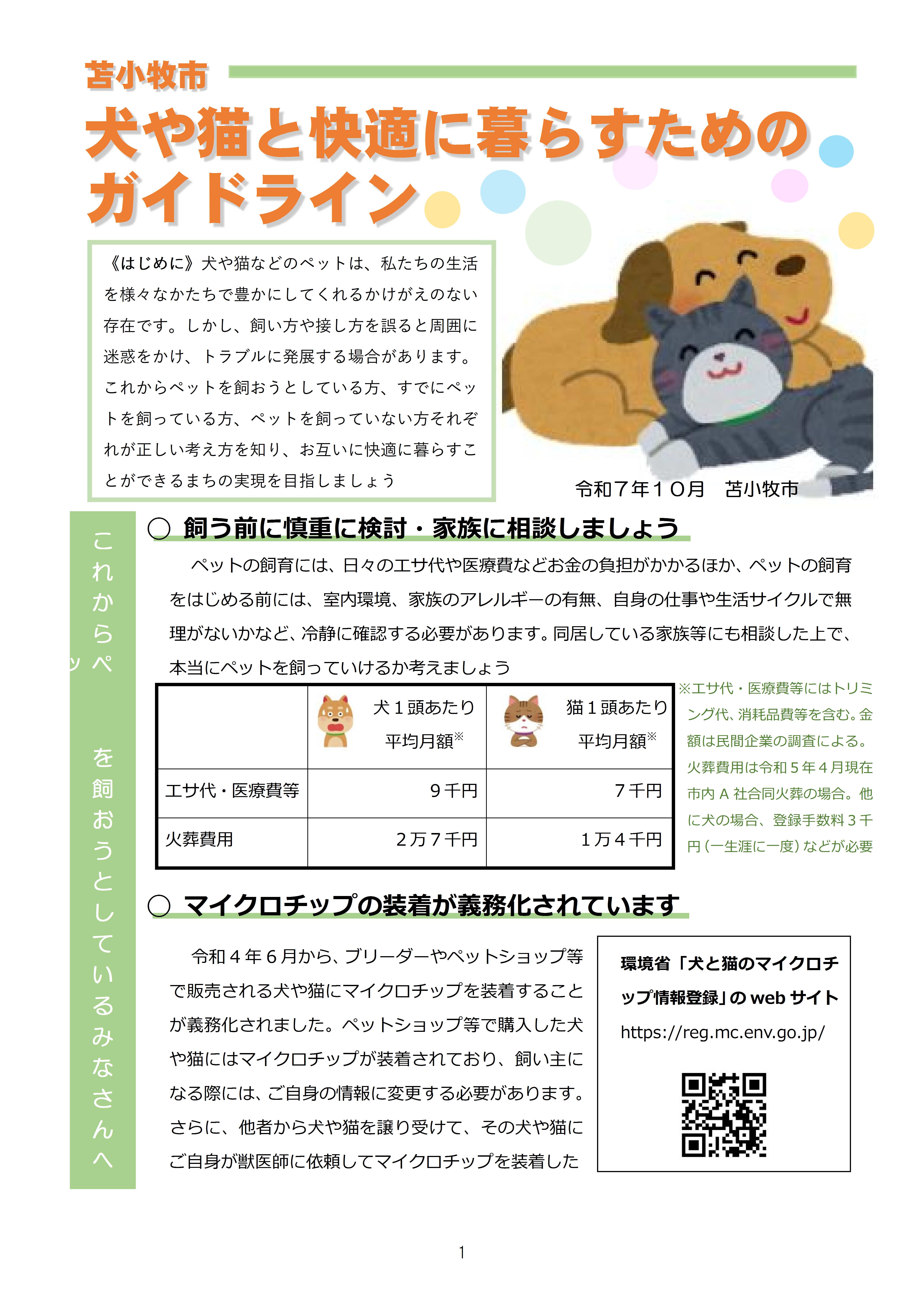 犬や猫などのペットは、私たちの生活を様々なかたちで豊にしてくれるかけがえのない存在です。しかし、飼い方や接し方を誤ると周囲に迷惑をかけ、トラブルに発展する場合があります。市では犬や猫と快適に暮らすことができるまちの実現のためにガイドラインを作成致しました。