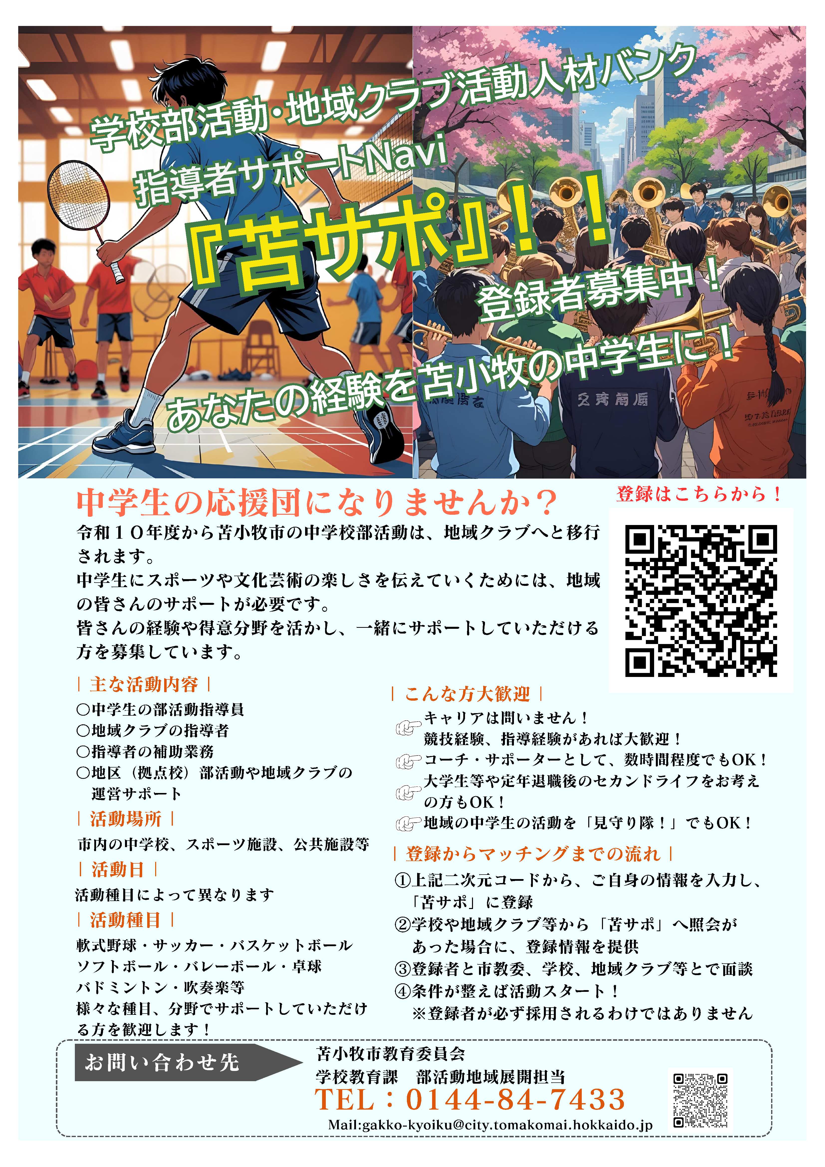 そこで、本市では「学校部活動・地域クラブ活動人材バンク指導者サポートNavi『苫サポ』」を設置しました。