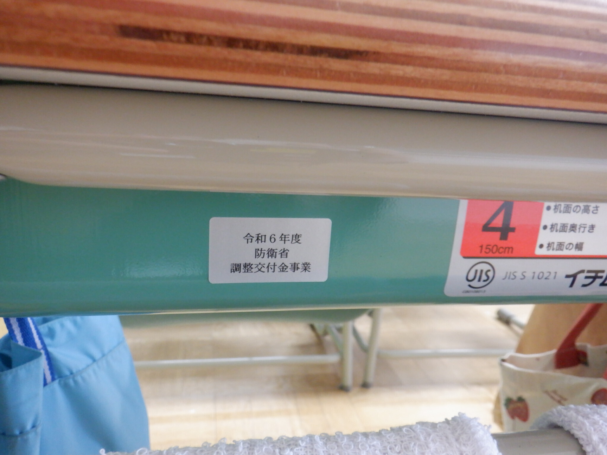 防衛省特定防衛施設周辺整備調整交付金を活用して市立小中学校の机・椅子を旧JIS規格のものから新JIS規格のものへ更新しています。平成29年度までに普通教室の更新が完了、令和3年度までに少人数指導用の更新が完了し、令和4年度から老朽化した机・椅子を更新しています。令和6年度については小中学校の普通教室用として机523台、椅子808脚を更新しました。