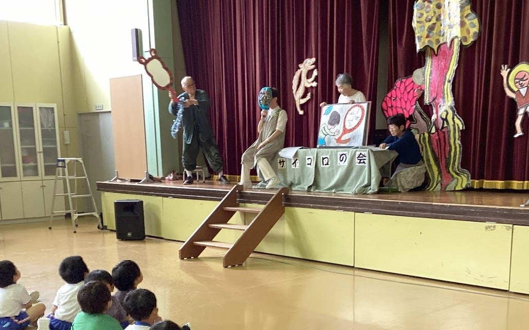 園児158人に『読み語り劇サークル サイコロの会』の皆さんが、大型絵本併用読み語り劇公演のアウトリーチを行いました。
