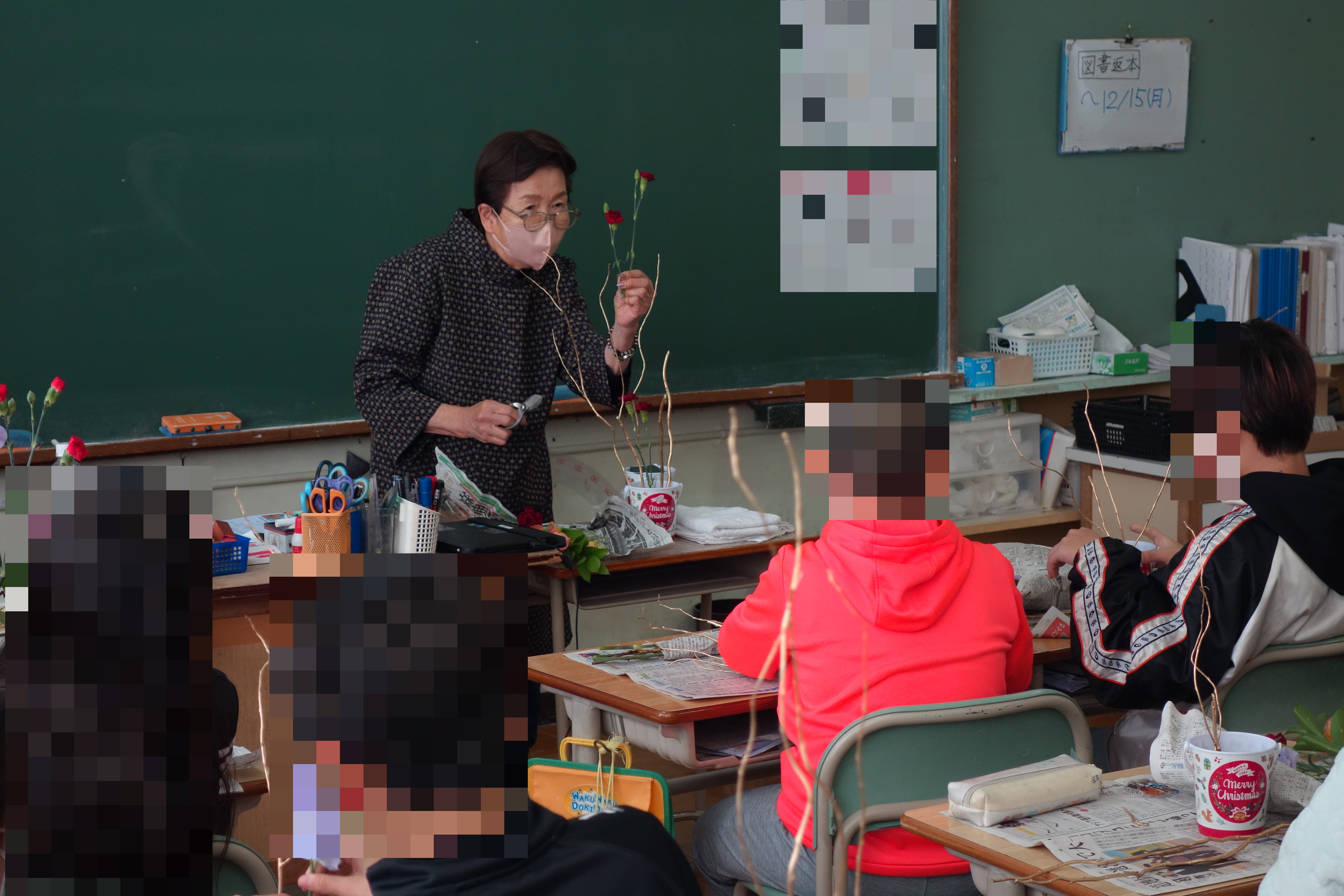 生徒22人に『一葉の会』の皆さんが、華道(池坊いけばな)のアウトリーチを行いました。