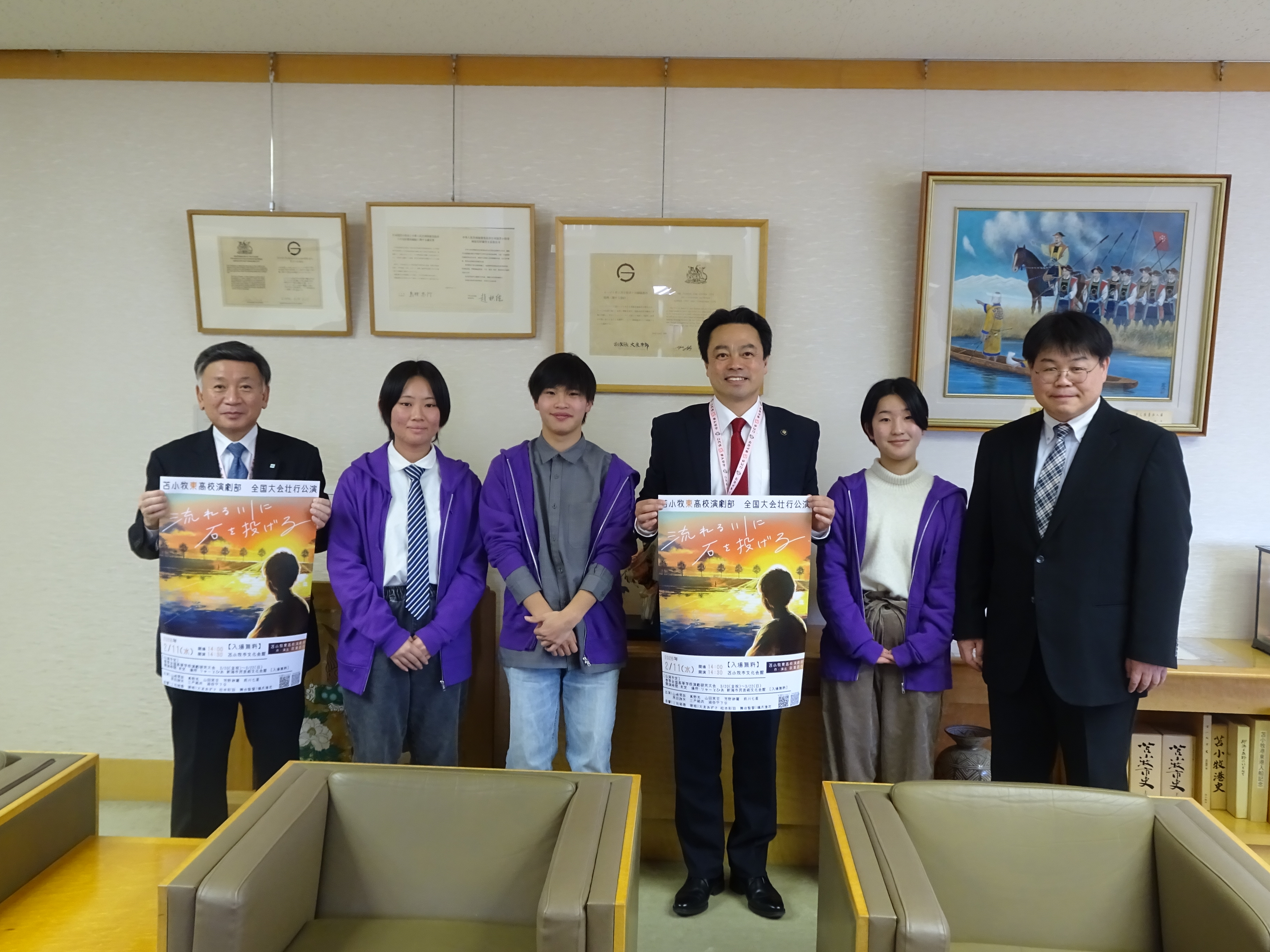11月に札幌市で開催された「第75回全道高等学校演劇発表大会」で優秀賞を受賞され、全国高等学校演劇協議会北海道ブロックからの推薦により、令和8年3月に新潟県で開催する「第20回春季全国高等学校演劇研究大会」に出場される苫小牧東高等学校演劇部の皆様が金澤市長を表敬訪問されました。演劇部は2大会連続での全国大会出場で、全道大会では優秀賞のほか、脚本・演出の秋葉直也さんが創作脚本奨励賞を受賞されました。