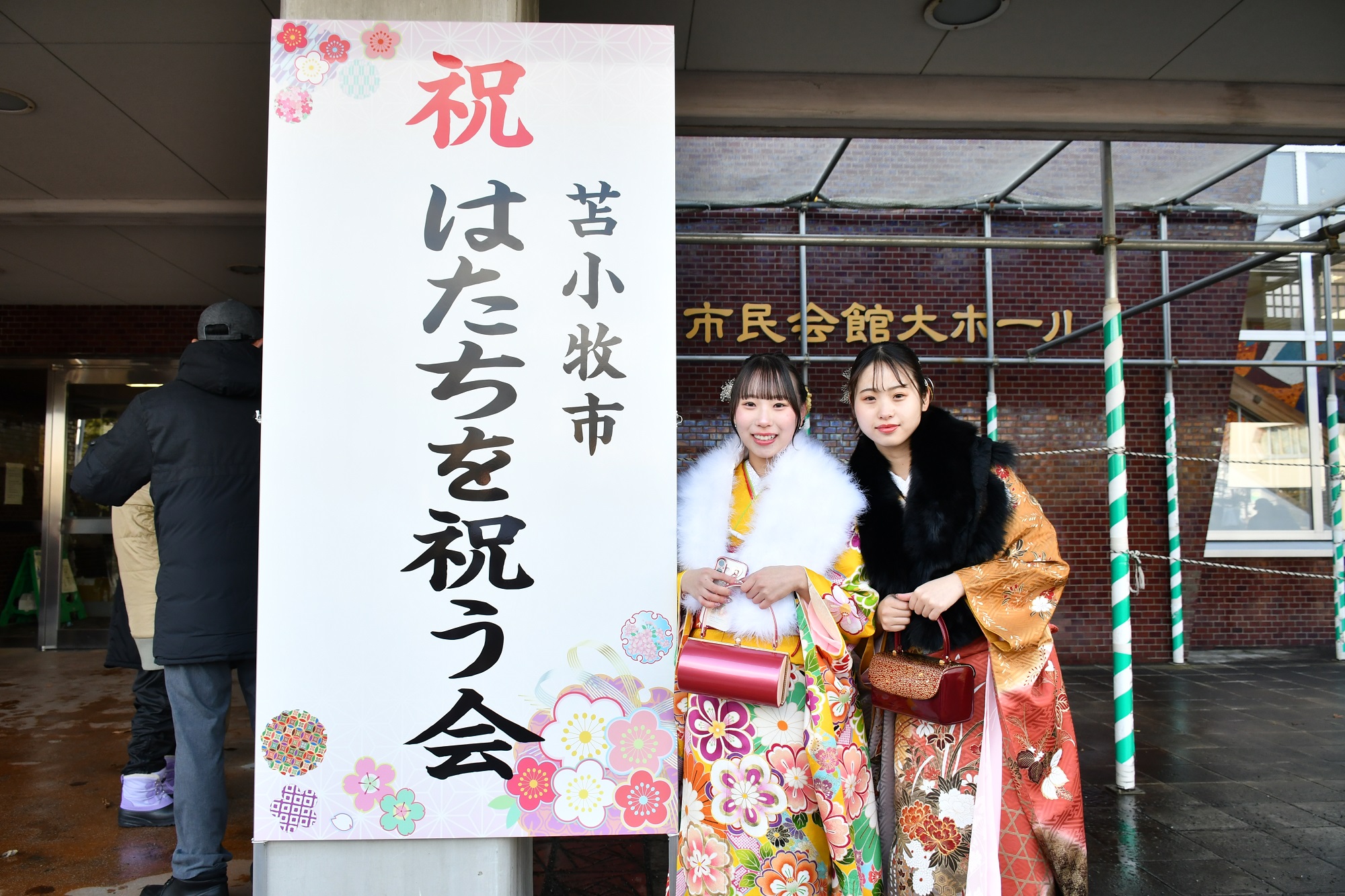 1月11日(日)に市民会館で「苫小牧市はたちを祝う会」が行われました。スーツや振り袖などに身を包んだ1,063人の参加者は、旧友との再会を楽しむとともに、大人への一歩を踏み出しました。