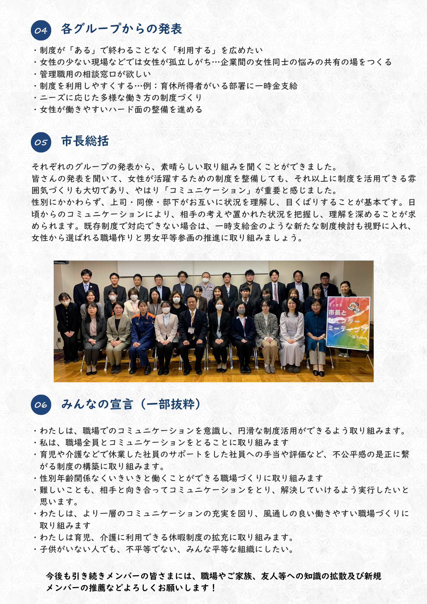 「誰もが働きやすい職場であるために必要なこと」についてグループディスカッションを行い、各グループで出た意見を発表していただきました。