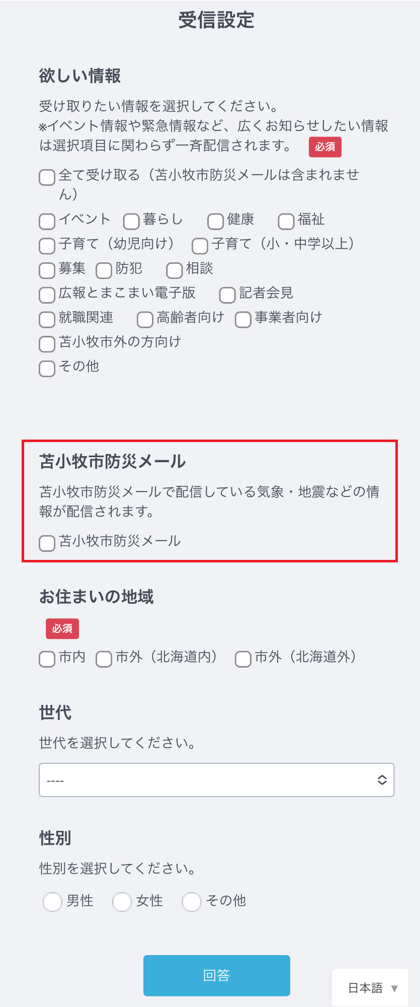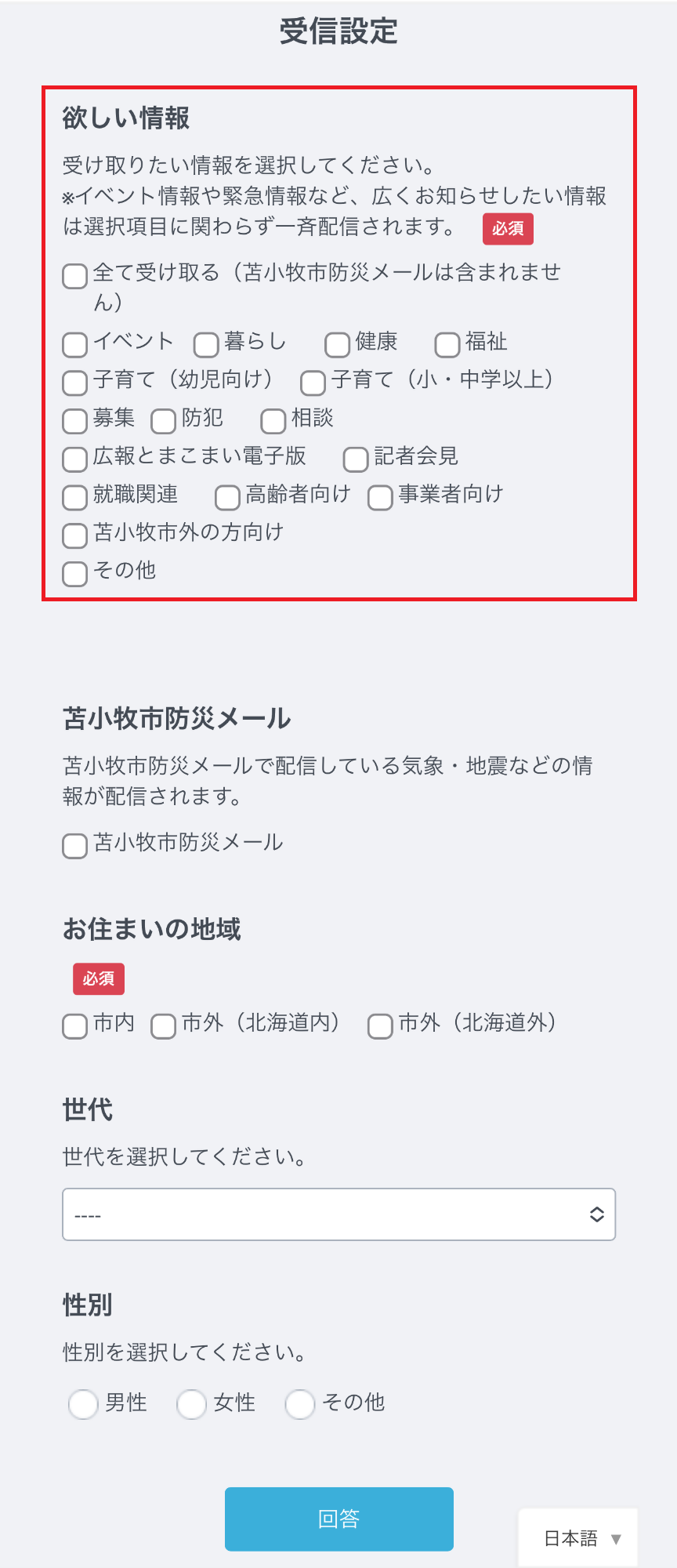 ※イベント情報や緊急情報など、広くお知らせしたい情報は、選択項目に関わらず一斉配信されます。