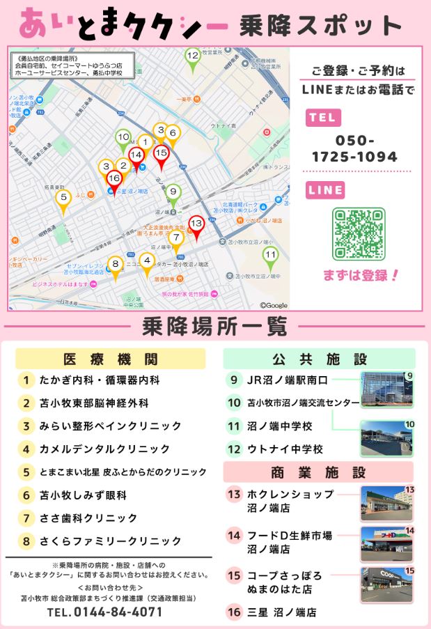 勇払住民のために、勇払と沼ノ端間で、通院・通学・買物(日常生活)に使っていただける、新しい移動手段です。このタクシーのすごいところ!!