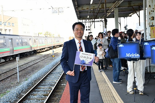 「HOKKAIDO LOVEひとめぐり号」おもてなしイベントに参加させていただきました。北海道の観光を盛り上げる企画でJALとJR北海道が実施したイベントでしたが、苫小牧駅に立ち寄った列車を、関係者と共にホーム内で歓迎させていただきました。列車および乗客の皆さんには、再び本市にお越しくださることを願っております。