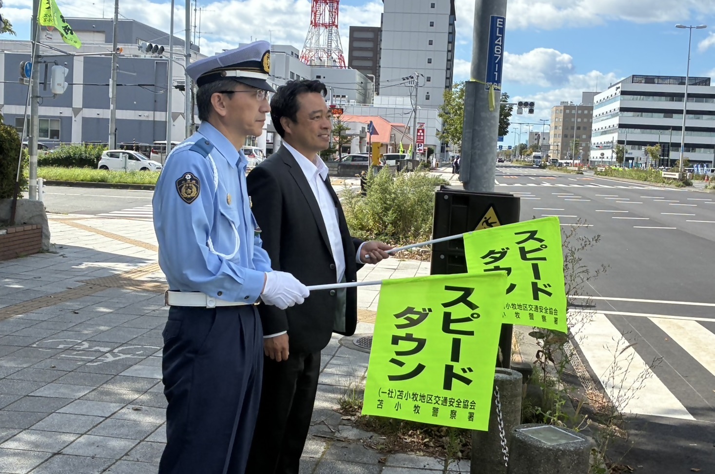 夏の交通安全運動が7月13日(日)から22日(火)の期間で実施されることから、一件でも事故を減らし、「安全で安心なまち とまこまい」を目指すため、関係機関、関係団体と共に、走行中のドライバーに安全運転を呼びかけました。