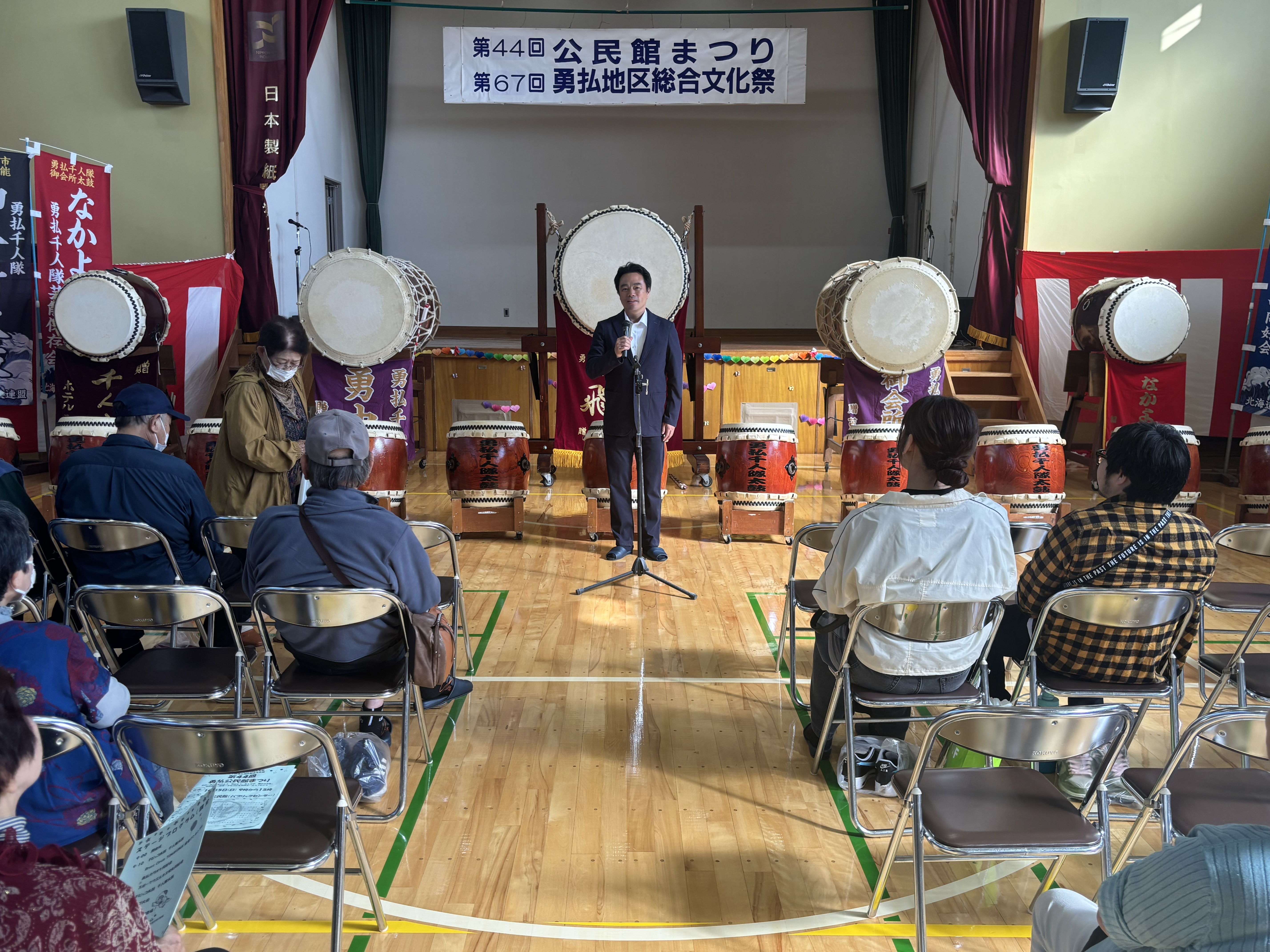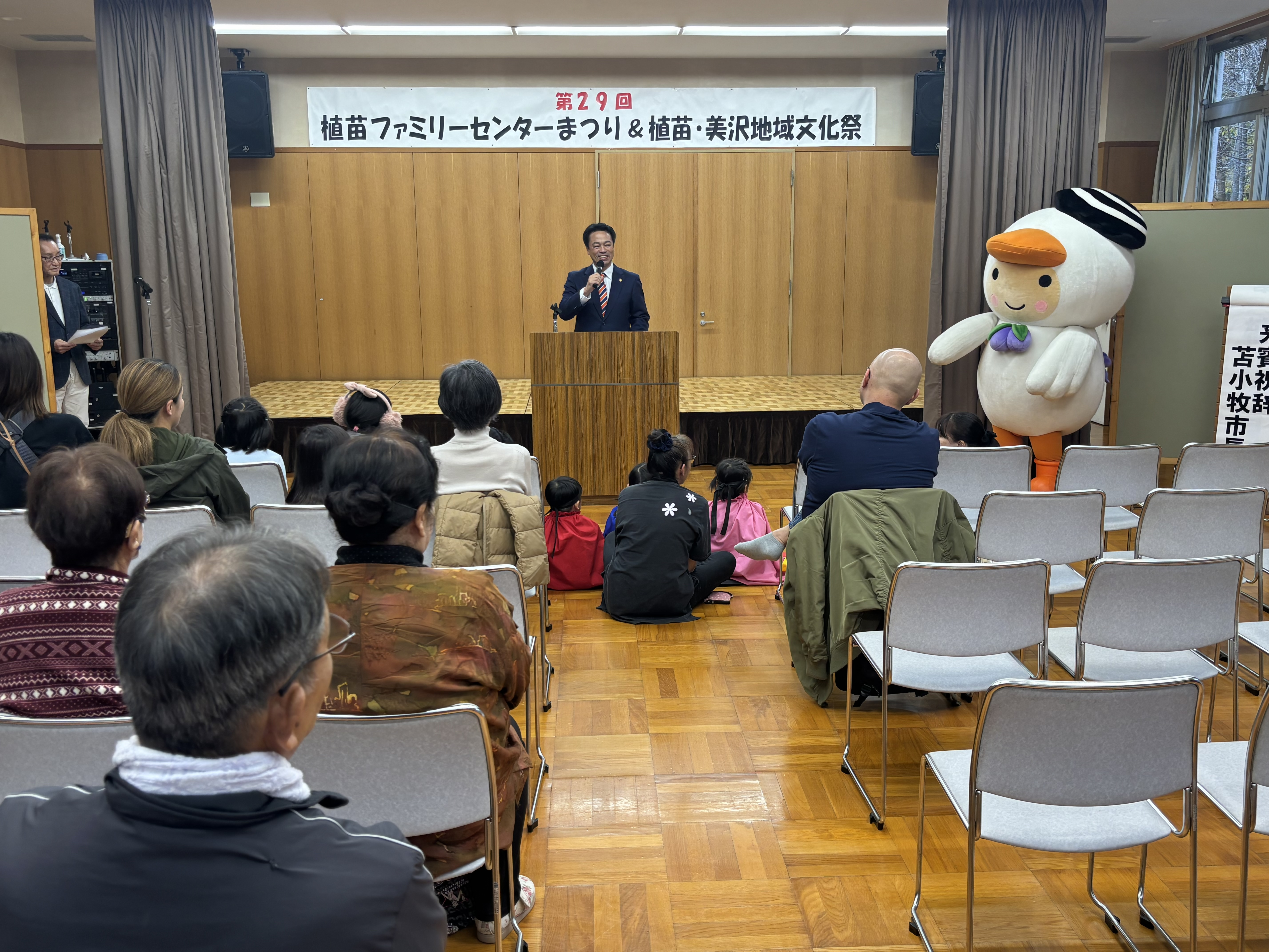 第29回植苗ファミリーセンターまつり 植苗・美沢地域文化祭でご挨拶をさせていただきました。文化祭を兼ねたこのお祭りは、地域の皆さんが交流を図る場として大変重要なイベントだと感じております。今後も、地域コミュニティ活動の拠点として、サークル活動や習い事をはじめ、多くの皆さんにさまざまな用途で施設をご利用していただきたいと思います。