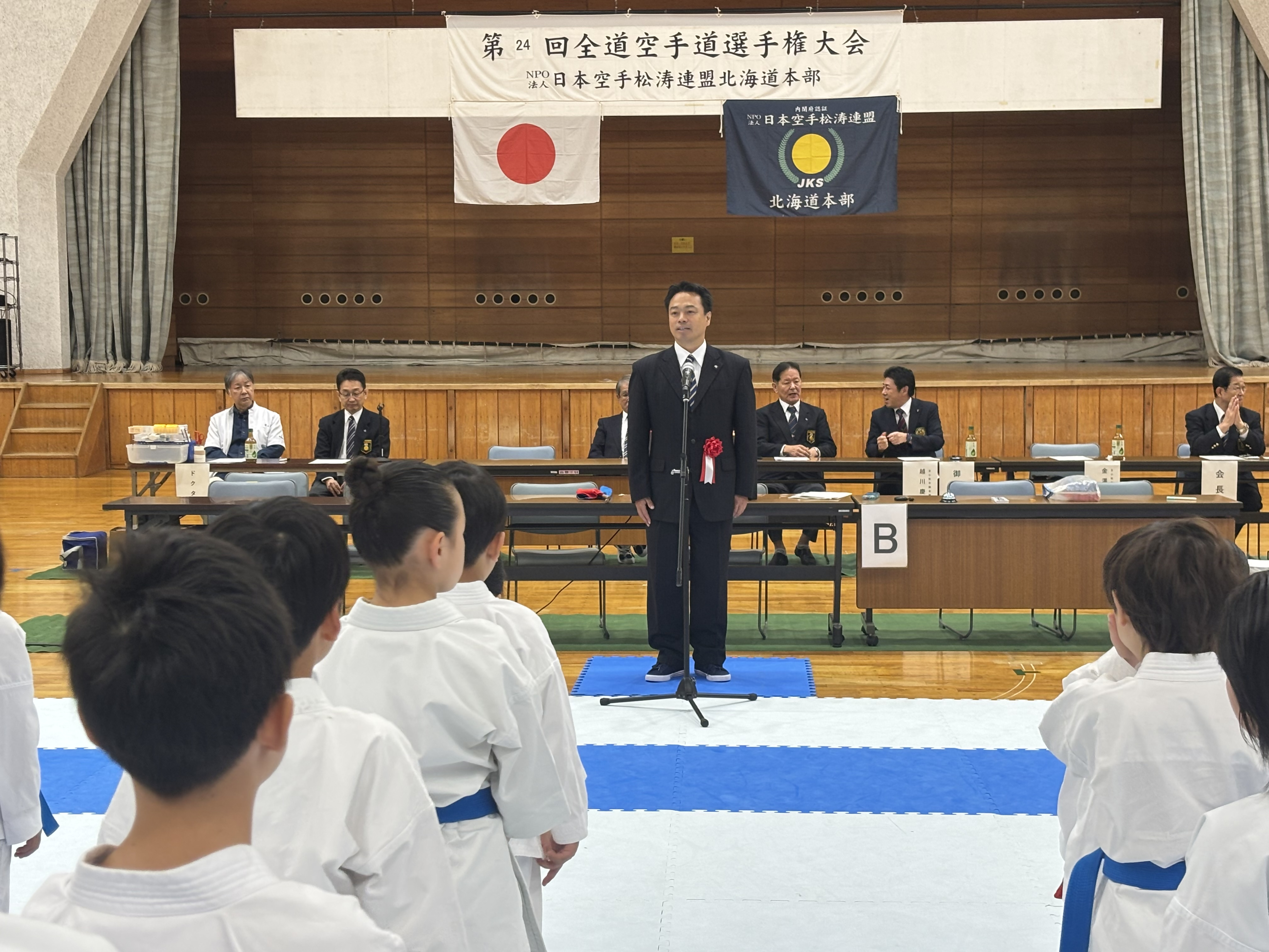 第24回日本空手松涛連盟全道空手道選手権大会兼第27回松涛連盟全国空手道選手権大会北海道予選が総合体育館で行われ、ご挨拶をさせていただきました。全道各地から多くの選手、関係者の皆さんにお越しいただき心より歓迎いたします。本市でこうした熱い大会が開催されますことを大変うれしく思います。