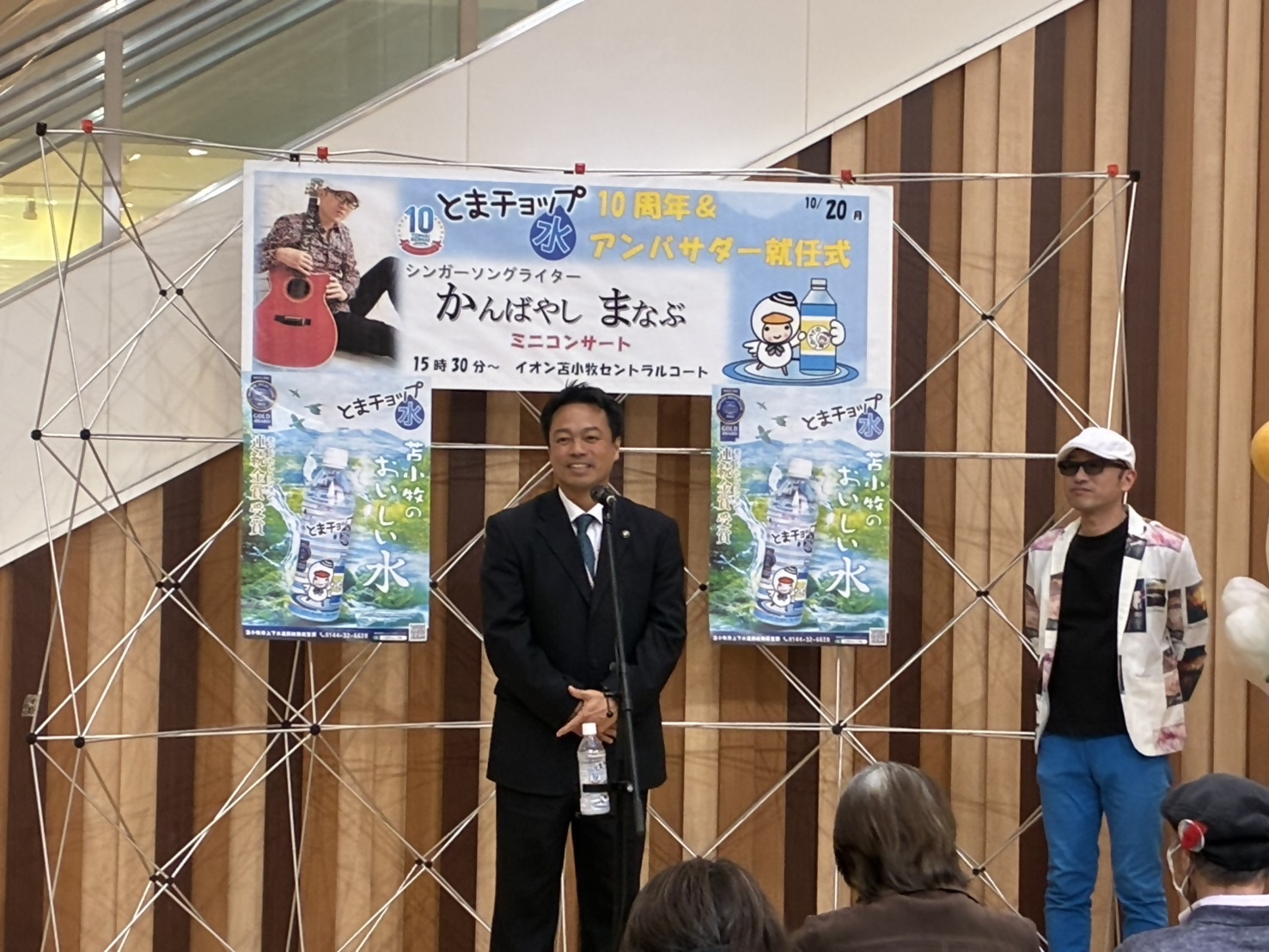 とまチョップ水10周年&アンバサダー就任式がイオンモール1階セントラルコートで行われ、ご挨拶をさせていただきました。本市が「おいしい水のまち」と知っていただきたいとの想いから、とまチョップ水が誕生して10周年を迎え大変うれしく思います。今後も自慢の水を世界中の皆さんに飲んでいただきたいと思います。