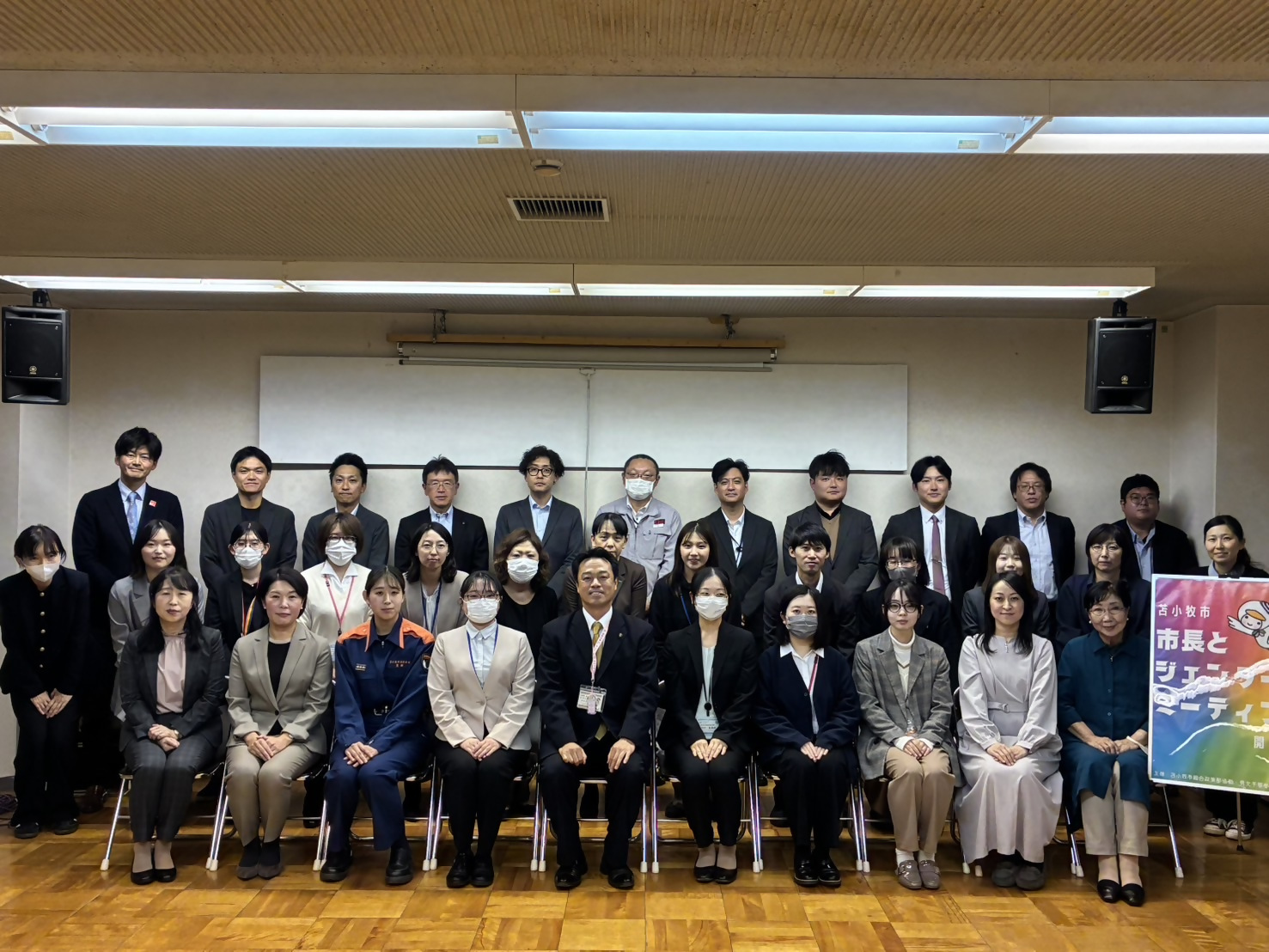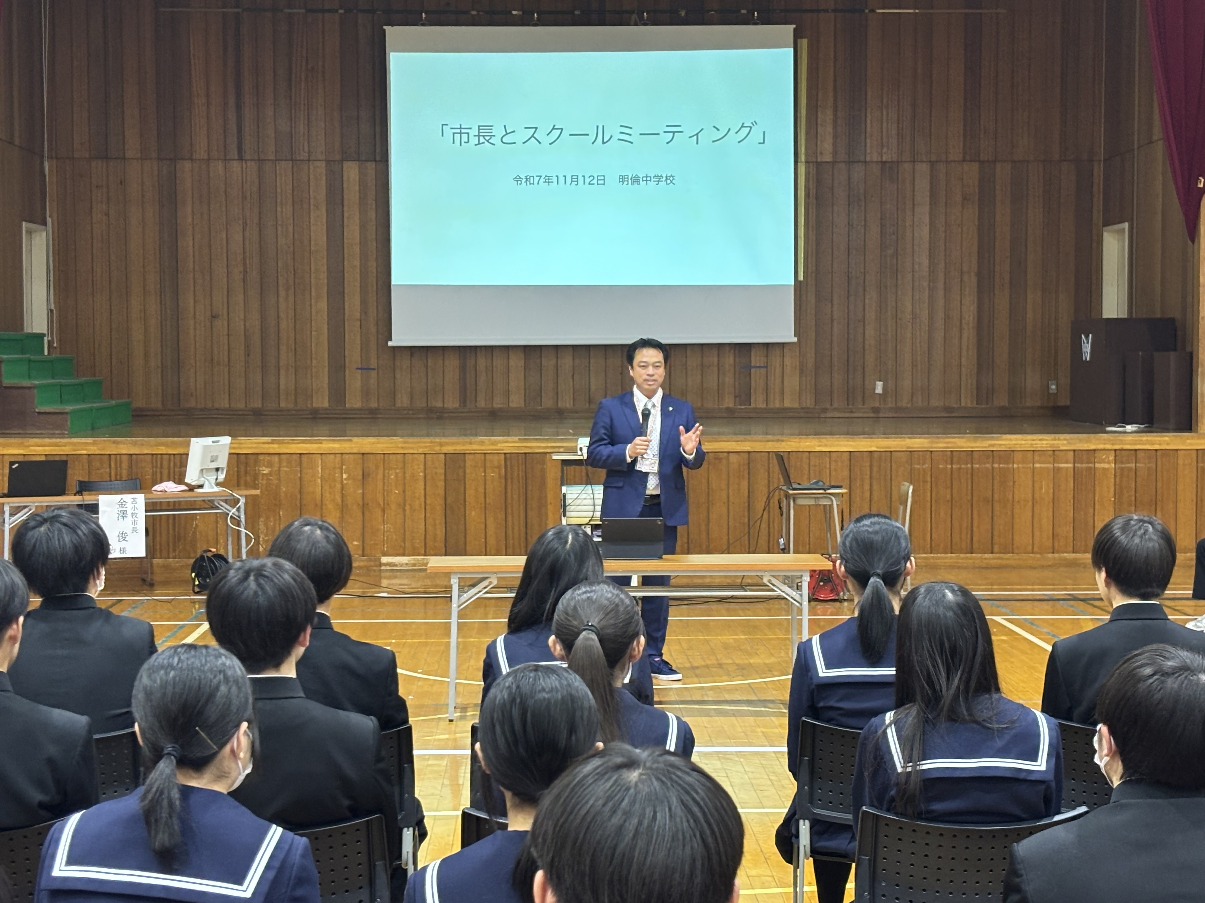 苫小牧市立明倫中学校で「市長とスクールミーティング」を行いました。自分たちが住んでいる地域や市の課題について生徒の皆さんからさまざまな提言をいただき、本市としてのこれまでの取り組みやまちづくりの思いを皆さんに伝えることができ、大変有意義なミーティングとなりました。