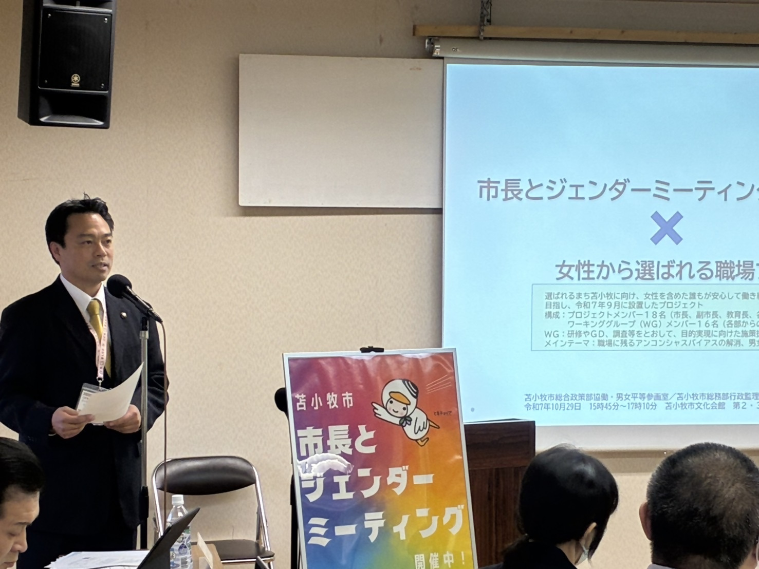 市民・団体・企業などと市が一体となって男女平等参画を推進するための会議「市長とジェンダーミーティング」に参加しました。グループディスカッションでは、「誰もが働きやすい職場であるために必要なこと」をトークテーマに活発な意見が出されました。