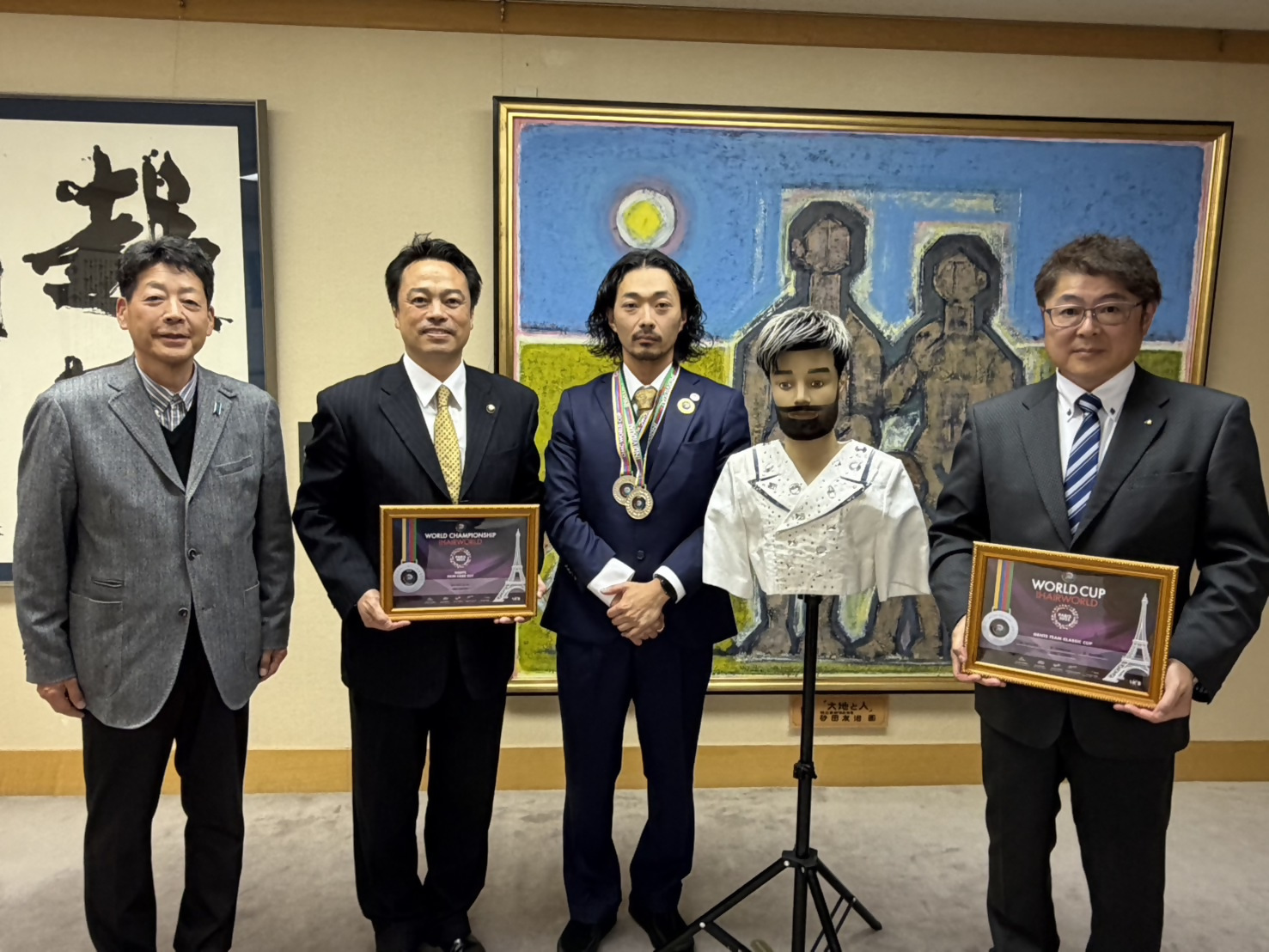 9月13日~15日にフランス・パリで行われた「ヘアワールド2025(世界理容美容技術選手権大会)で、ロースキンフェードカット(刈り上げの技術やデザインを競う)部門およびクラシックカテゴリーの団体総合部門で見事銀メダルを獲得された、渡利勇太氏による表敬訪問を受けました。世界最高峰のコンテストでの輝かしい成績を心よりたたえ、深く敬意を表します。