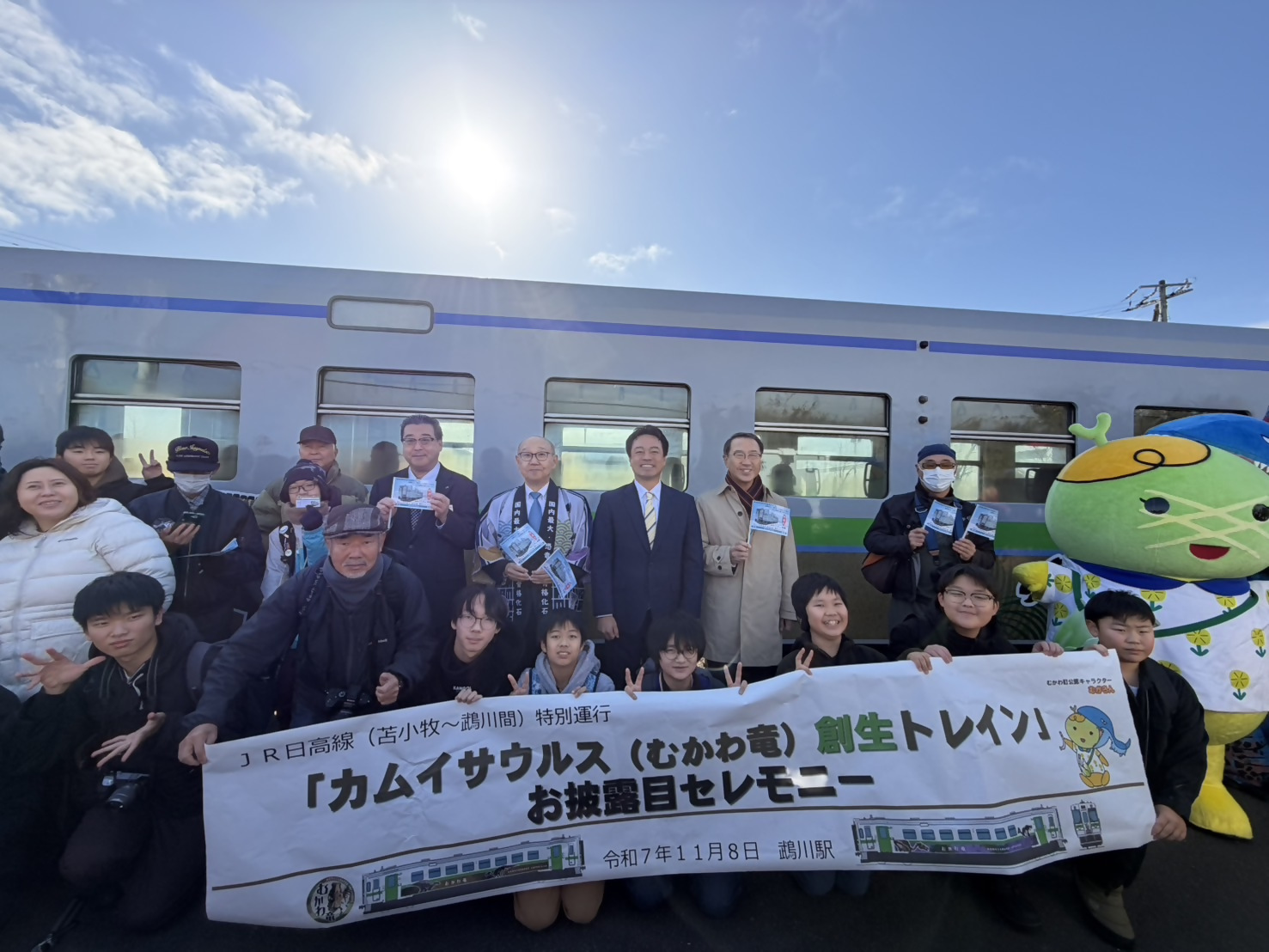 本年春に引退した復興トレインの後継車両として新たにデザインされた「カムイサウルス(むかわ竜)創生トレイン」のお披露目・乗車会でご挨拶をさせていただきました。このイベントを通して、乗降客の利用促進につながることを心より願っております。本市としても、JR日高線沿線自治体の一員として厚真町・むかわ町の皆さんと共に応援してまいります。