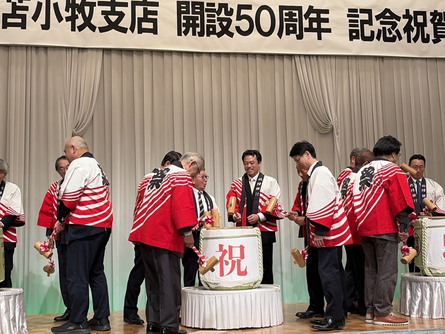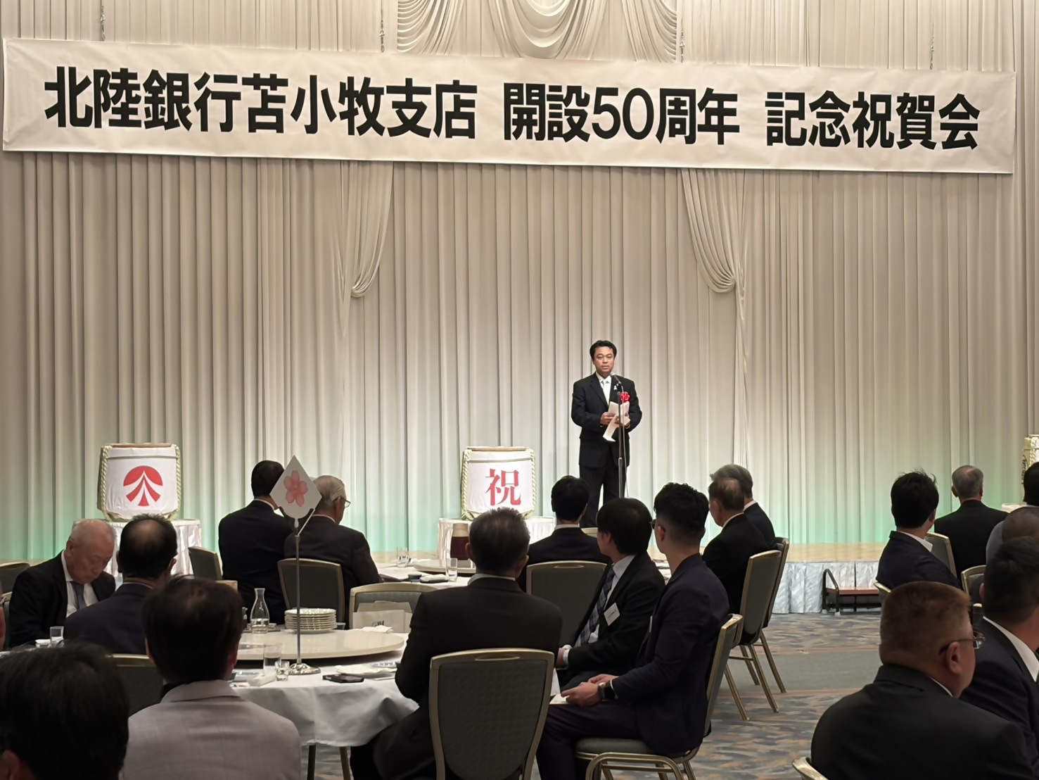 北陸銀行苫小牧支店開設50周年式典でご挨拶をさせていただきました。長年にわたり地域の経済発展や市民の支えとして大きな役割を果たしてこられたことに、深く敬意を表します。今後ますます地域に根ざした金融機関としてさらなるご発展をお祈り申し上げます。