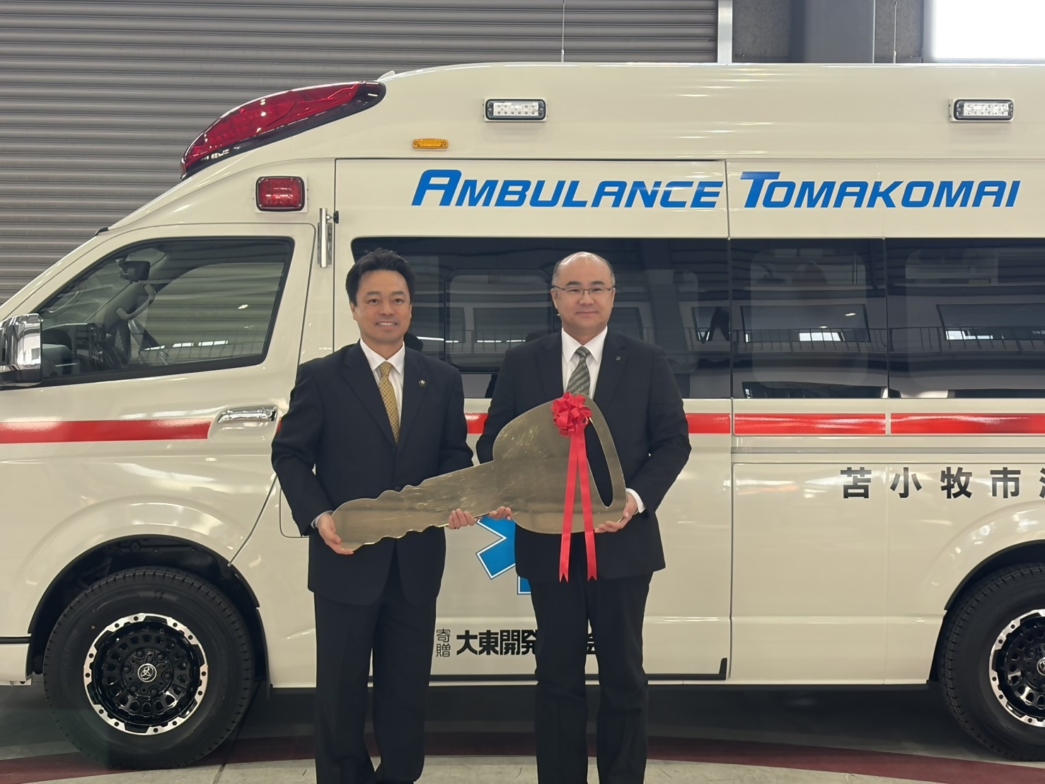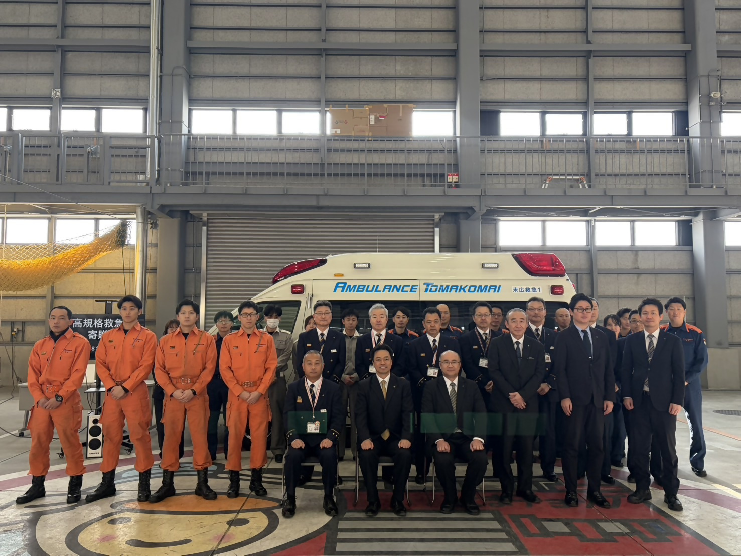 大東開発(株)からいただいた、高規格救急車の寄贈式が行われました。本市に対する心温まるご厚意に心より感謝申し上げます。寄贈された救急車は、市民の尊い命を守るため、救急医療の現場で大切に活用させていただきます。