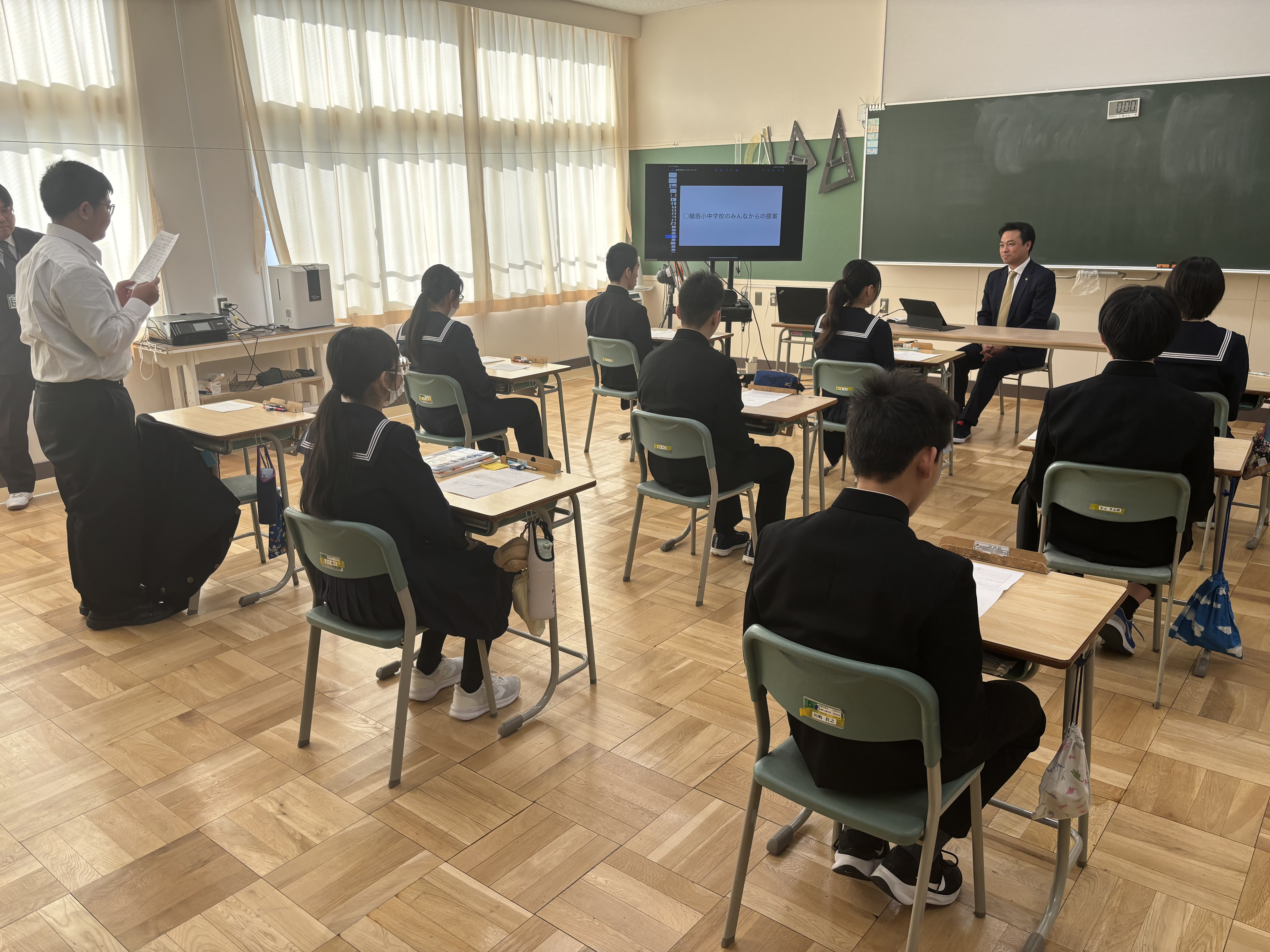 苫小牧市立植苗小中学校で「市長とスクールミーティング」を行いました。自分たちが住んでいる地域や市の課題について、生徒の皆さんからさまざまな提言をいただき、本市としてのこれまでの取り組みや、まちづくりの思いを生徒の皆さんに伝えることができました。