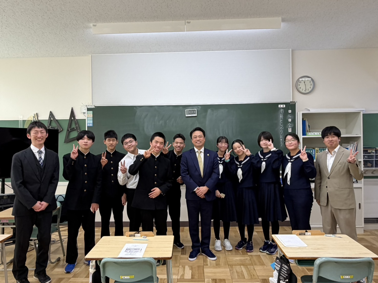 苫小牧市立和光中学校で「市長とスクールミーティング」を行いました。自分たちが住んでいる地域や市の課題について生徒の皆さんからさまざまな提言をいただき、本市としてのこれまでの取り組みや、まちづくりの思いを生徒の皆さんに伝えることができました。