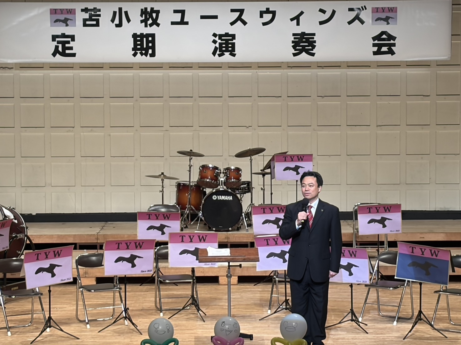 文化会館で行われた「苫小牧ユースウィンズ第3回定期演奏会」でご挨拶をさせていただきました。日頃から、市が主催する行事や地域イベントなどに積極的に参加していただくとともに、小学生向けの演奏会・楽器体験会を開催するなど、吹奏楽やマーチング演奏の普及にご尽力いただいていることに対し、心より敬意と感謝を申し上げます。今後も元気で楽しい演奏を多くの市民に伝えていただきますよう、お願い申し上げます。