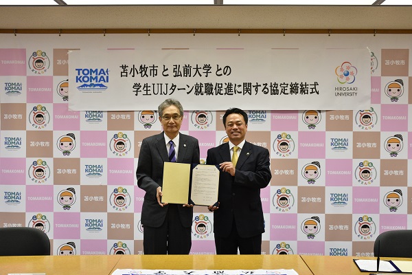 苫小牧市と弘前大学は令和7年8月26日付けで、苫小牧市内企業の人材確保及び学生の就職活動を支援し、苫小牧市出身者をはじめとする学生のUIJターン就職の一層の促進を図ることを目的として、協定を締結しました。