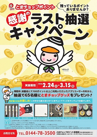 とまチョップポイント事務局において、長年のご愛顧への感謝の気持ちを込め、ポイントを最後まで有効にご活用いただくため「感謝のラスト抽選キャンペーン」を実施しております。