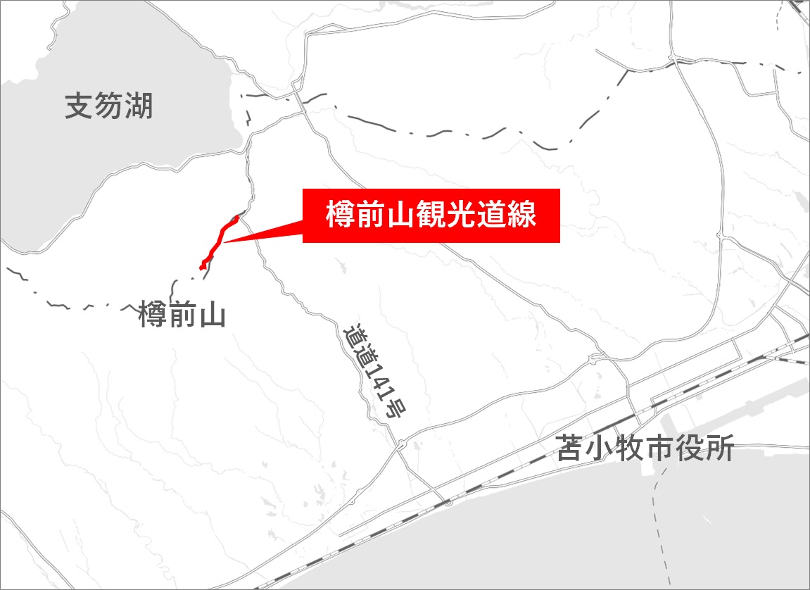 樽前山観光道線は、苫小牧市が管理する道路で、道道141号樽前錦岡線との交差点に位置する5合目ゲートから、7合目駐車場までを結ぶ、延長約2.7kmの砂利道です。