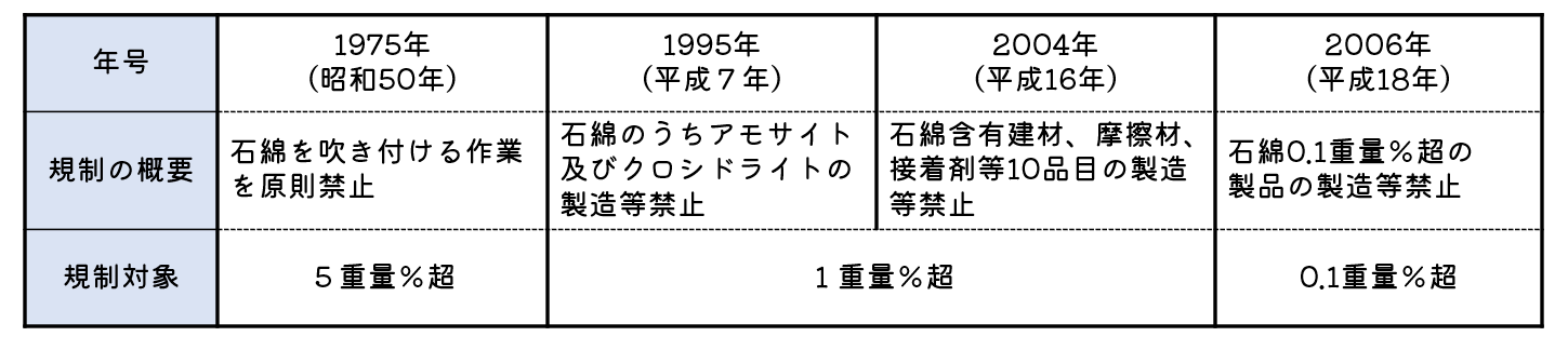 アスベスト規制に係る法の変遷は以下の表のとおりとなります。