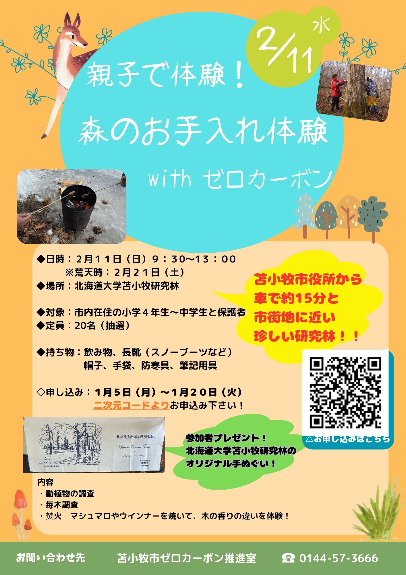 森林整備体験「秘密基地を作ろう!」 | 自然の中で、遊びや体験を通して森林整備を学び、森林環境保全への意識を高めます。 | 苫小牧市民 (小学生以下) 親子20名 ※抽選 |